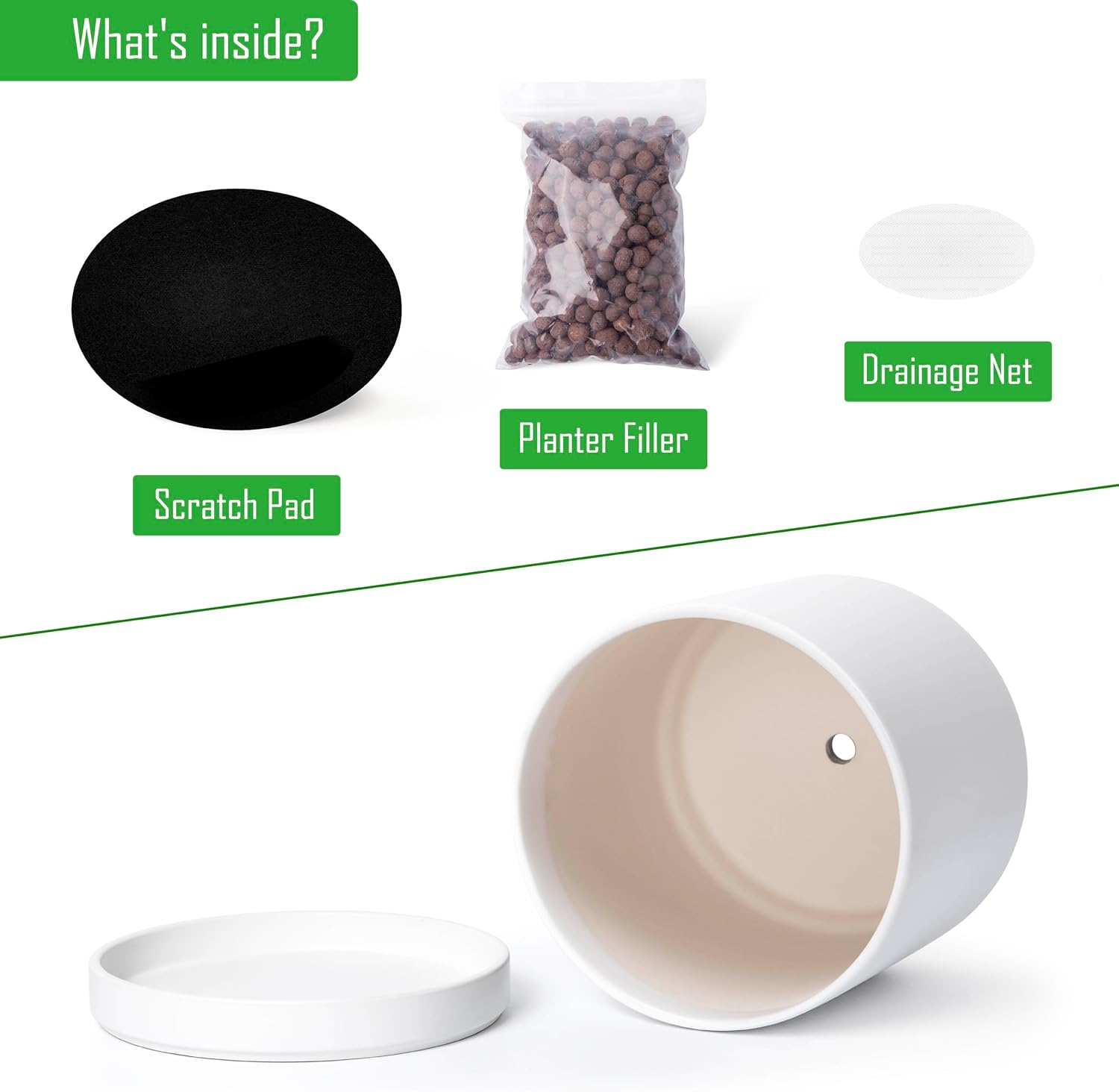 - Planter pot with drainage hole, mesh drainage net and protective scratch pad included.