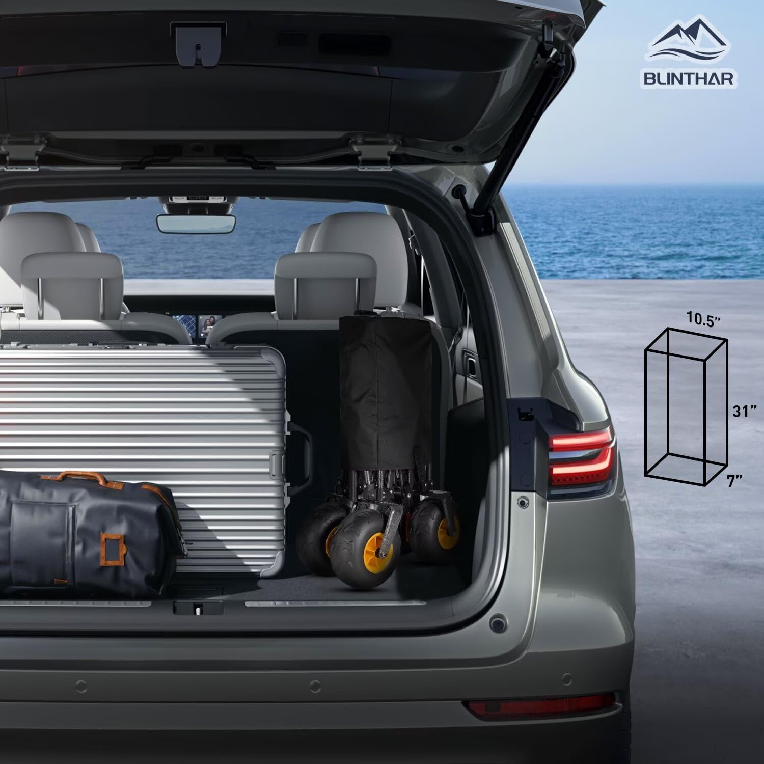 - 【Large Capacity】The BLINTHAR foldable wagon offers an expanded size of 35.4" x 19.7" x 23.6"; Balloon Wheel Size: 9" x 4"; Inner Dimensions: 35.4" x 18.1" x 13". When folded, it measures just 10.5" x 7" x 31", making it easy to fit into any car.Retractable handle telescopes up to a height of 37.5" for pulling comfort and ease of use.