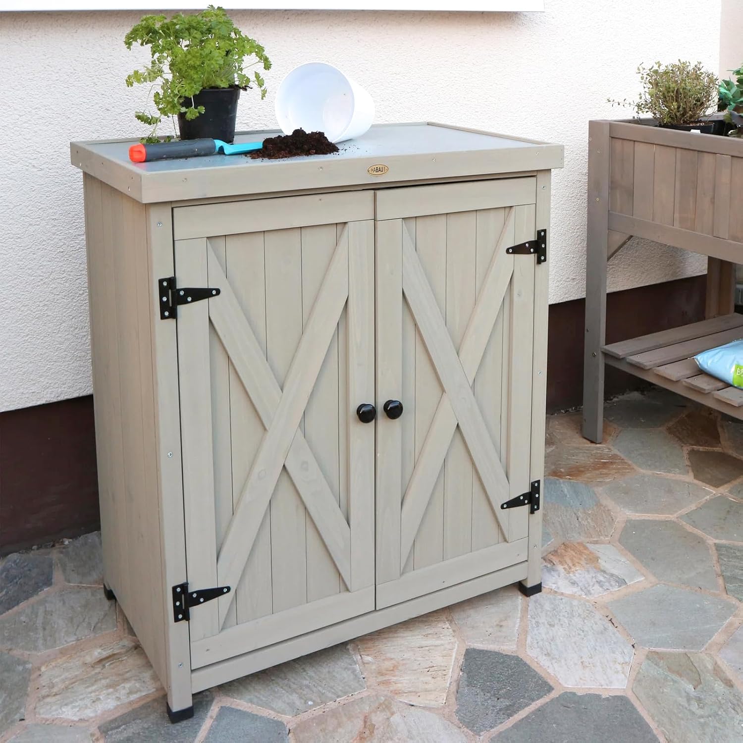 Outdoor Storage Cabinets Weatherproof for Patio, Garden Work Bench with Shelves & Metal Tabletop, Wooden Potting Table Workstation