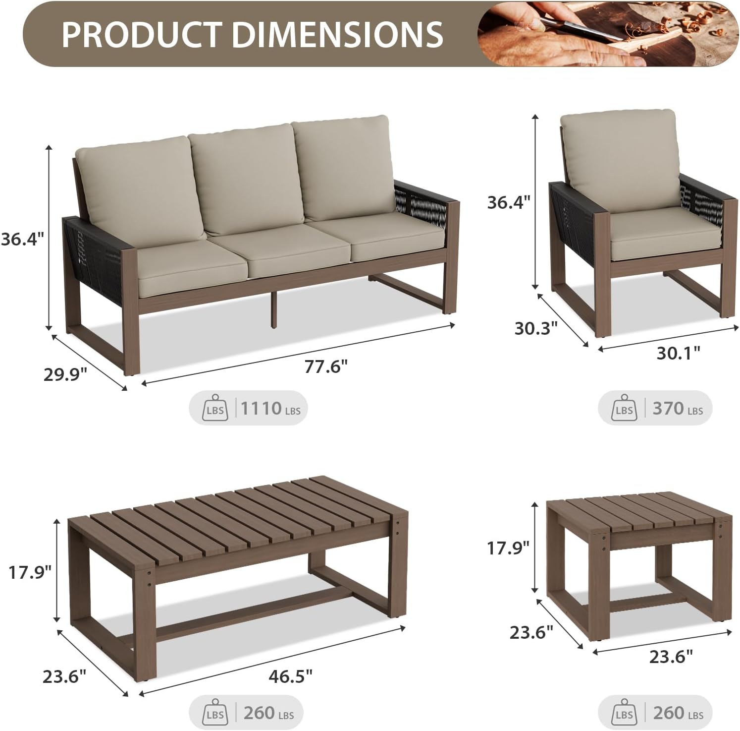 - VERSATILE USE: This conversation set includes a 3 seat sofa, 2 patio chairs, coffee table and a small sqaure side table. real wood tables are embossed to show the natural hues. It's outdoor weather resistant quality makes it ideal for patios, decks, porches, and poolside areas.