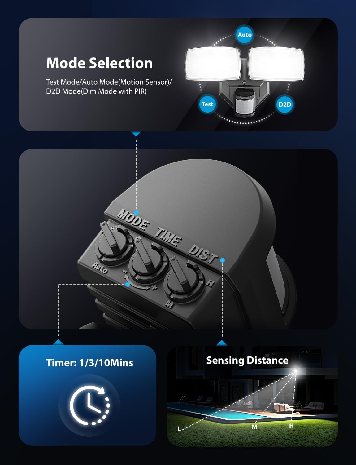 - Dusk to Dawn Mode: Equipped with the Dusk to Dawn function, this motion flood lights outdoor automatically turn off during the day and operate at 30% brightness at night. When motion is detected, they instantly brighten to 100%, ensuring energy efficiency and enhanced security.