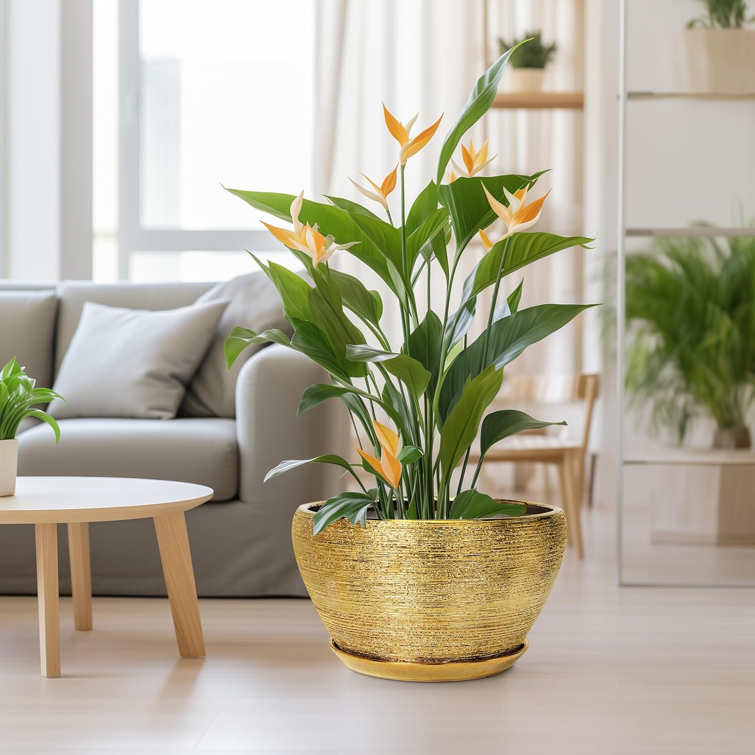 Ceramic Planter 13 Inch - Indoor Plant Pot with Drainage Hole and Saucer Large Ceramic Pot for Plants Mid-Century Decorative Modern Outdoor Flower Pot for Home Decor Gold