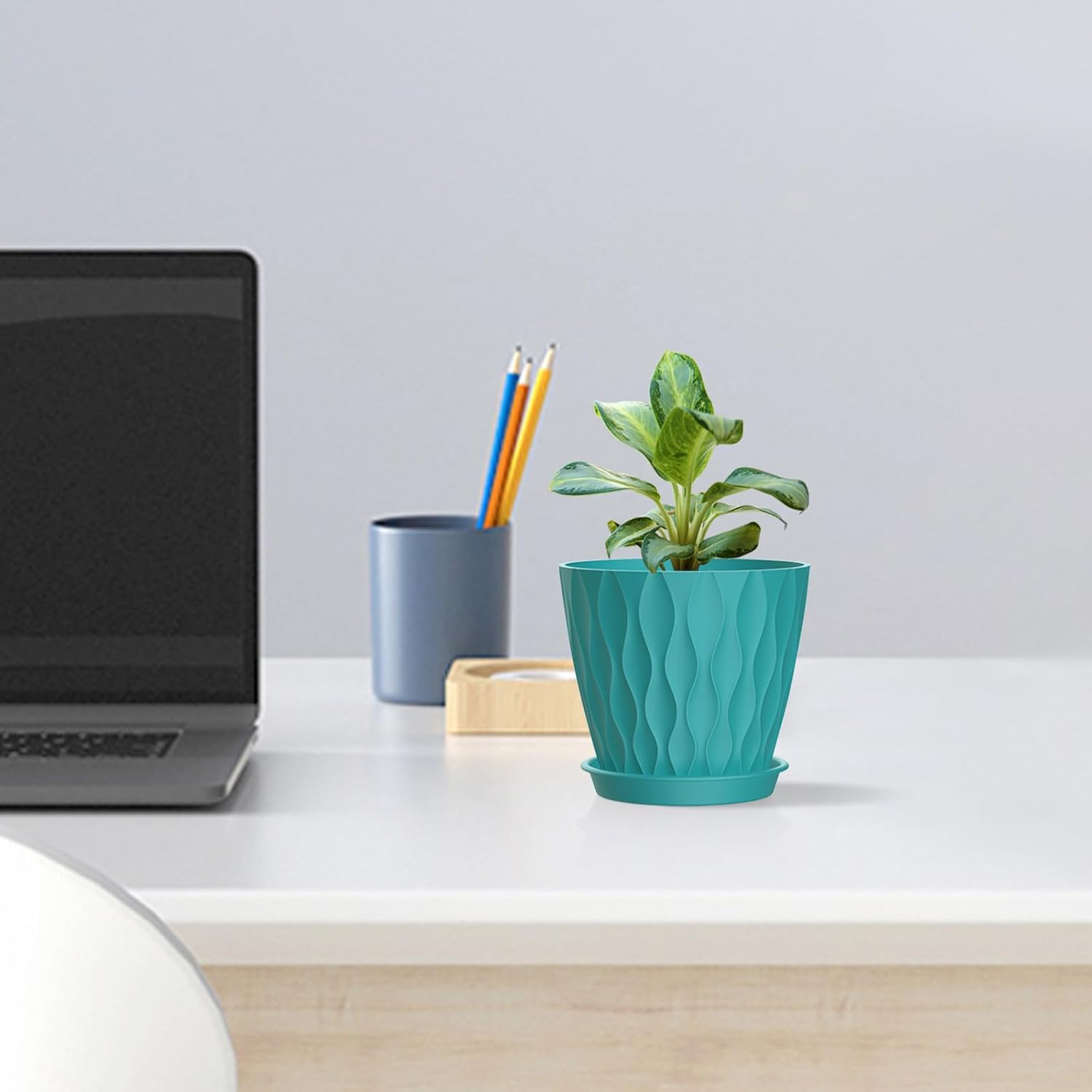 4 inch Small Plastic Nursery Pots, 5 Pack Water Ripples Flower Pots for Indoor Plants, Plant Pots with Drainage Holes and Saucers, Seedling Starter Planters for House Plants, Blue Green