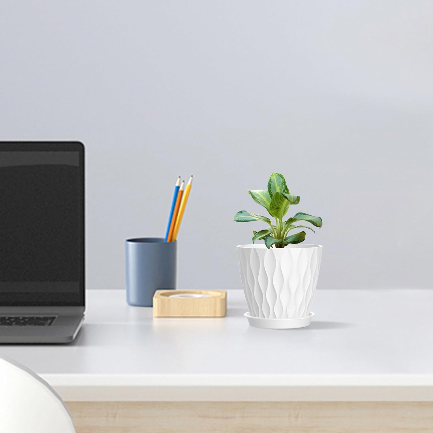 4 inch Small Plastic Nursery Pots, 5 Pack Water Ripples Plant Pots for Indoor Plants, Flower Pots with Drainage Holes and Saucers, Seedling Starter Planters for Succulent Plants, White