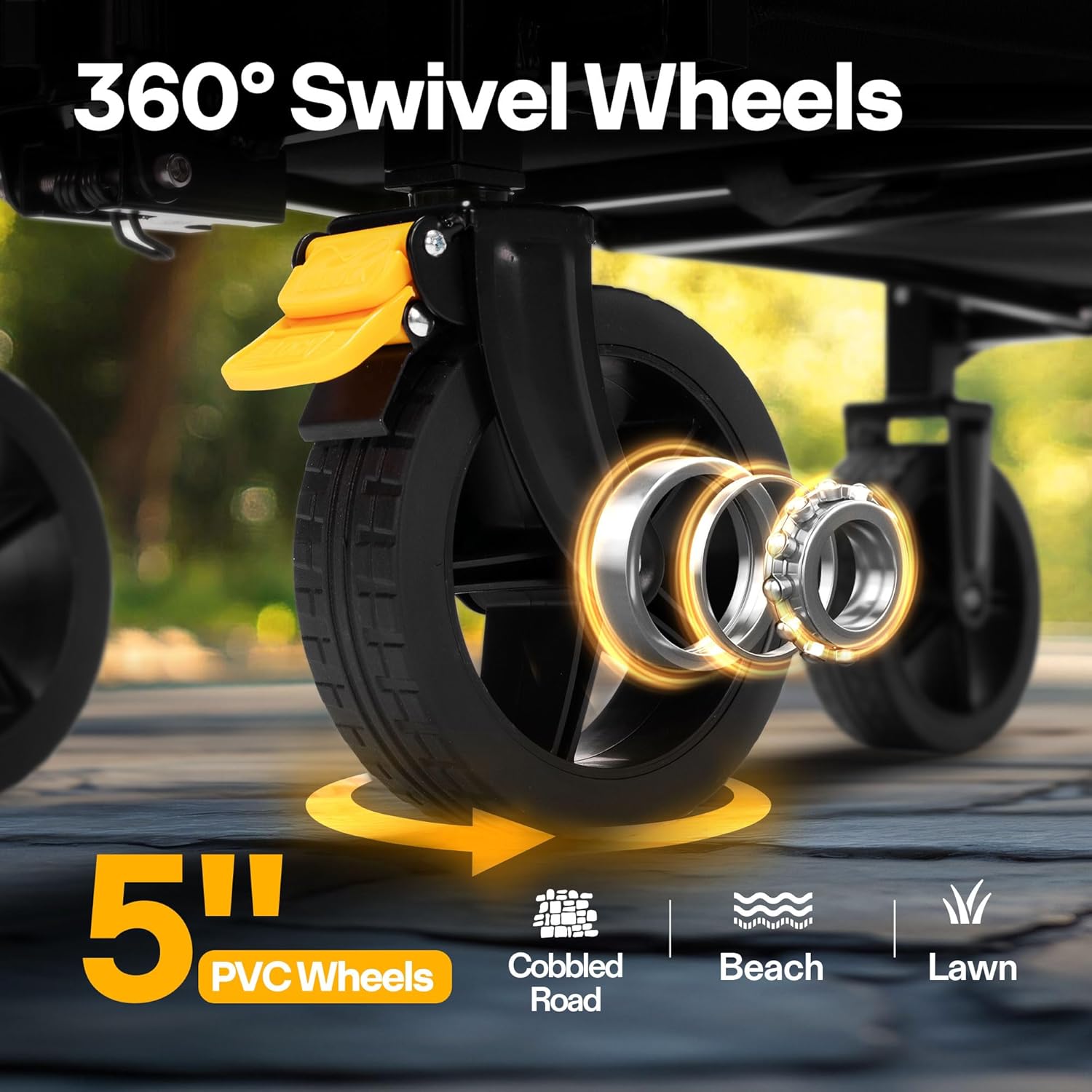 - 360Β° SWIVEL WHEEL: This collapsible wagon is equipped with four 5-inch PVC all-terrain wheels designed to handle hard sand, grass, and uneven surfaces; The rear wheels include brakes for added stability when parked on slopes; Perfect for gardening tasks like hauling various flowers, fertilizers, and gardening supplies with ease