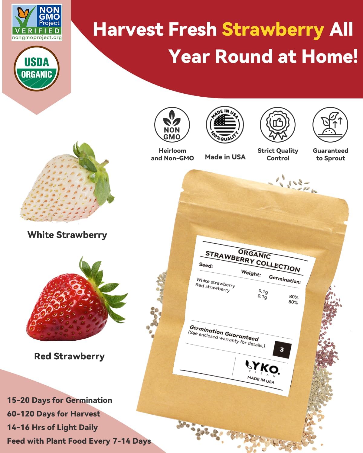 - HEIRLOOM & NON-GMO SEEDS MADE IN THE USA - All our seeds are grown and packaged in America. All seeds are organic, heirloom, and non-GMO. Our high germination seeds allow you to plant all year round, even in winter. Enjoy the fresh harvest of the strawberries directly to your recipes