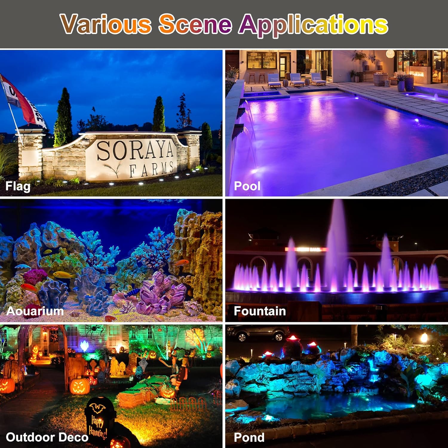 - 2 Types of Installation: Complete with accessories, the base can be fixed in the water, used as underwater lights, can also be installed on the ground or wall, used as landscape lights, either way, perfect for pool, pond, garden, path road, and other decoration lighting