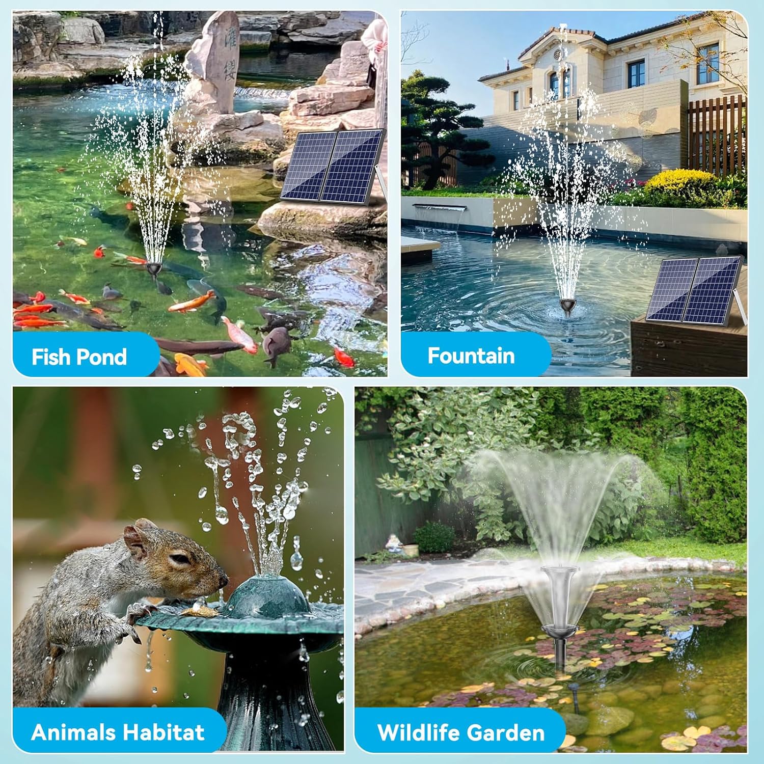 - ⛲【Wide Applications & Warranty】The solar powered water pump is easy to install, just and plug & play. Perfect for pond, garden decoration, fish tank, Waterfall, Hydroponics and water circulation for oxygen etc.. All of our solar fountain has a one year warranty and professional technical support team to deal with issues. If you have any problems, please let us know.