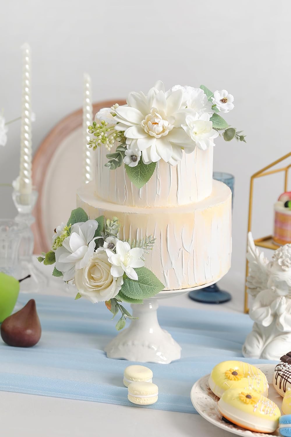 YYHUAWU Fake Flower Heads Mini White Artificial Flower Faux Dahlia Rose Flowers Multicolor Silk Daisy Flower Heads for Craft Garland Wedding Bridal Baby Shower Home Party Decoration DIY Cake Decor