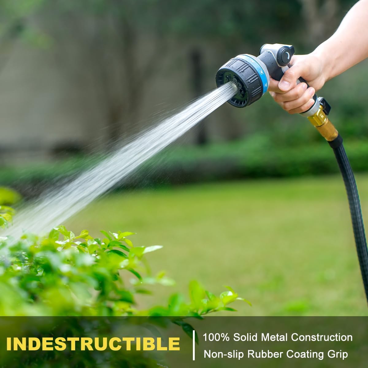 - HEAVY-DUTY GARDEN HOSE NOZZLE: The nozzle gun body is constructed with zinc-alloy material, solid & robust to resist rust, corrosion and wear. The shock resistant rubberized bezel dial can enhance durability & flexibility and withstand hard impacts & heavy force in daily drops and shocks. It is much stronger, more durable and long-lasting than plastic water nozzles.