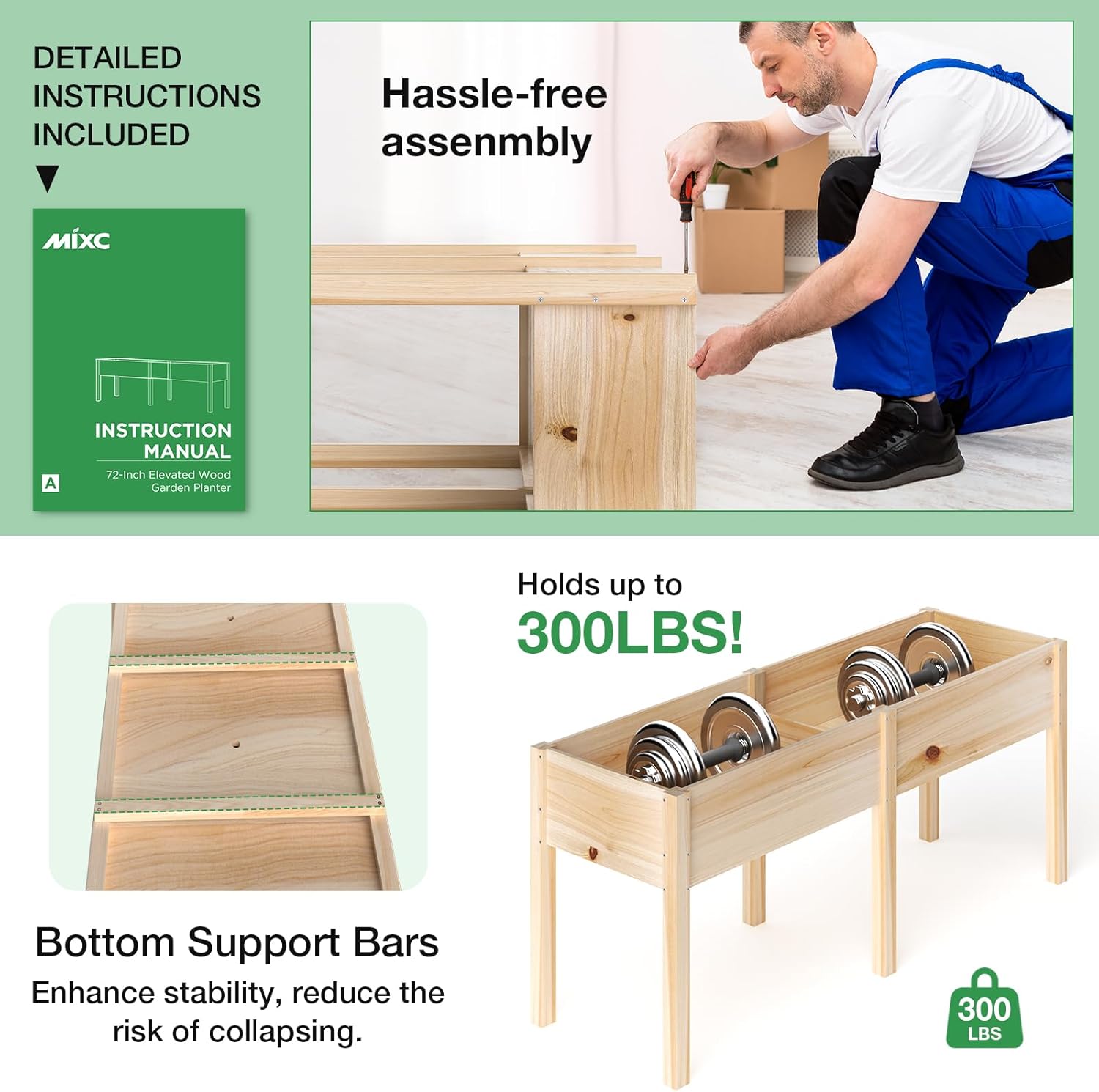 MIXC 72”L X 23”W Raised Garden Bed Outdoors with Legs, Elevated Reinforced Wooden Large Planter Box for Backyard, Patio, Balcony w/Divider Panel, 6 Legs, 300lb Capacity