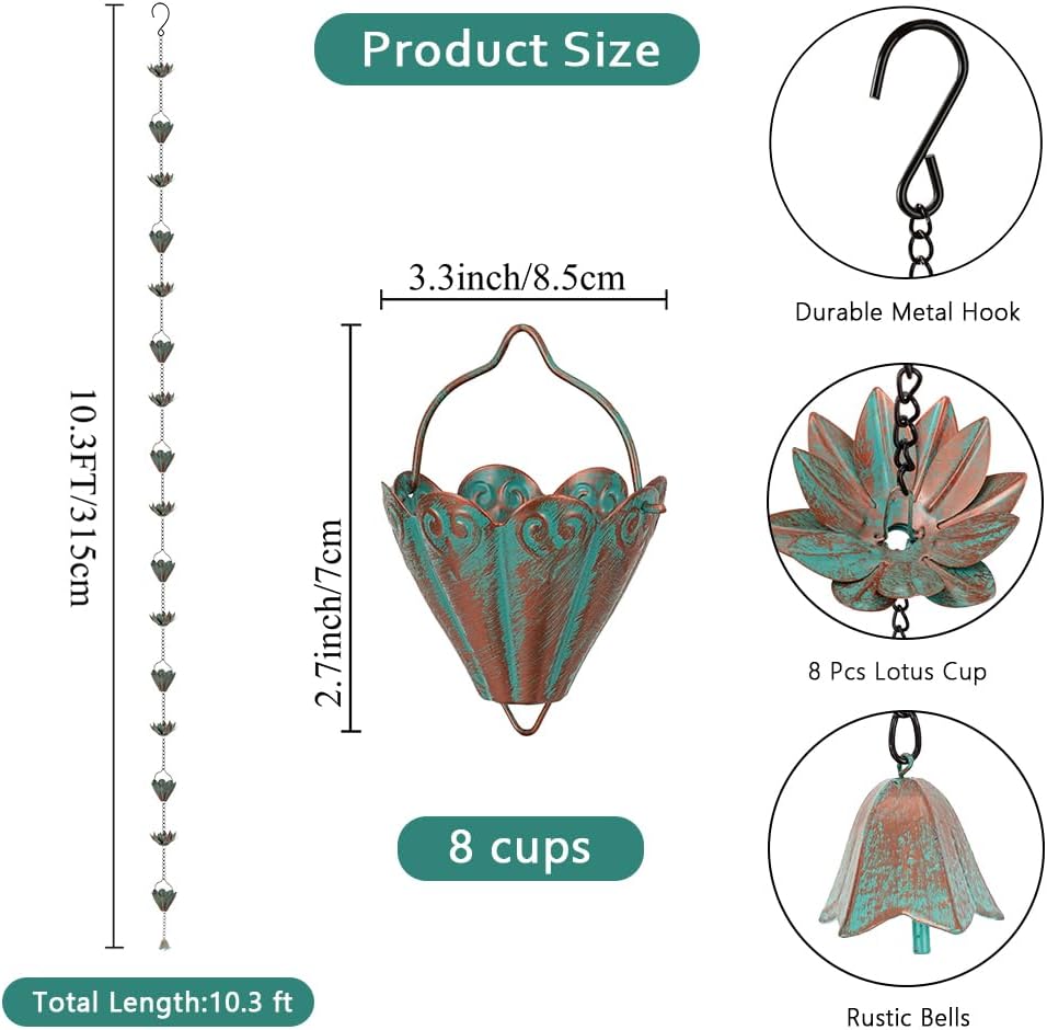 - Artistic Atmosphere: The rain chain for gutters consists of 16 vintage lotus cups. As rainwater trickles down the chain, give the quiet courtyard an elegant and unique beauty