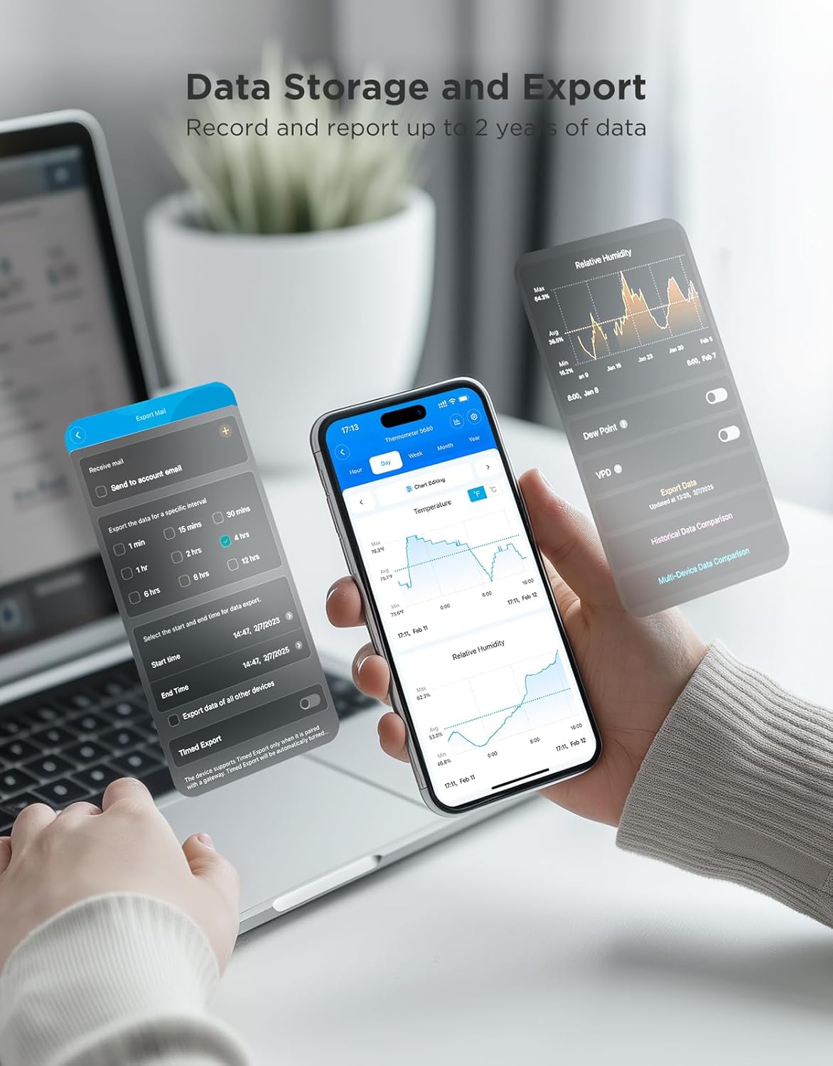 - Data Storage & Export: This bluetooth hygrometer thermometer sensor uploads data to the app via bluetooth. View the temperature and humidity trend chart from the past 20 days and export data from the past 2 years. Ideal for greenhouses, farms, etc.