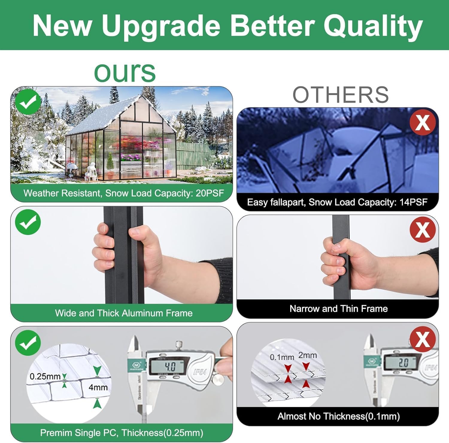 - Sturdy Frame: Our greenhouse kit boasts a robust rust-resistant aluminum frame designed to withstand various weather conditions. 2 skilled enthusiasts can assemble this greenhouse kit within just 4-6 hours. Introducing patented technology, Easy assembly, saving you 50% of your time. Gone are the days of tedious setups. With a simple push and locking screw, our Quick Connect ensures a reliable, secure, and swift link-up. It can also support snow loads of up to 20PSF