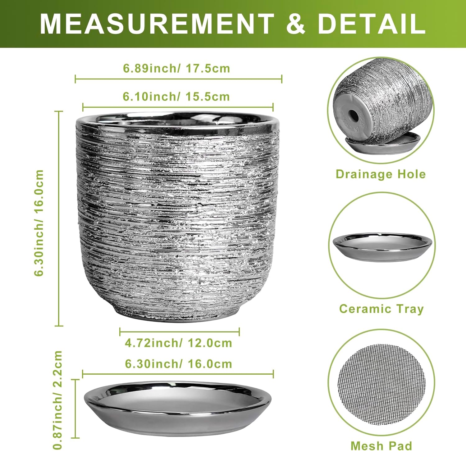 - Size of Silver Planter: Each 7 inch plant pot is 6.89β D x 6.57β H. A matching saucer to prevent leaks, allowing you to place plant pot anywhere with confidence
