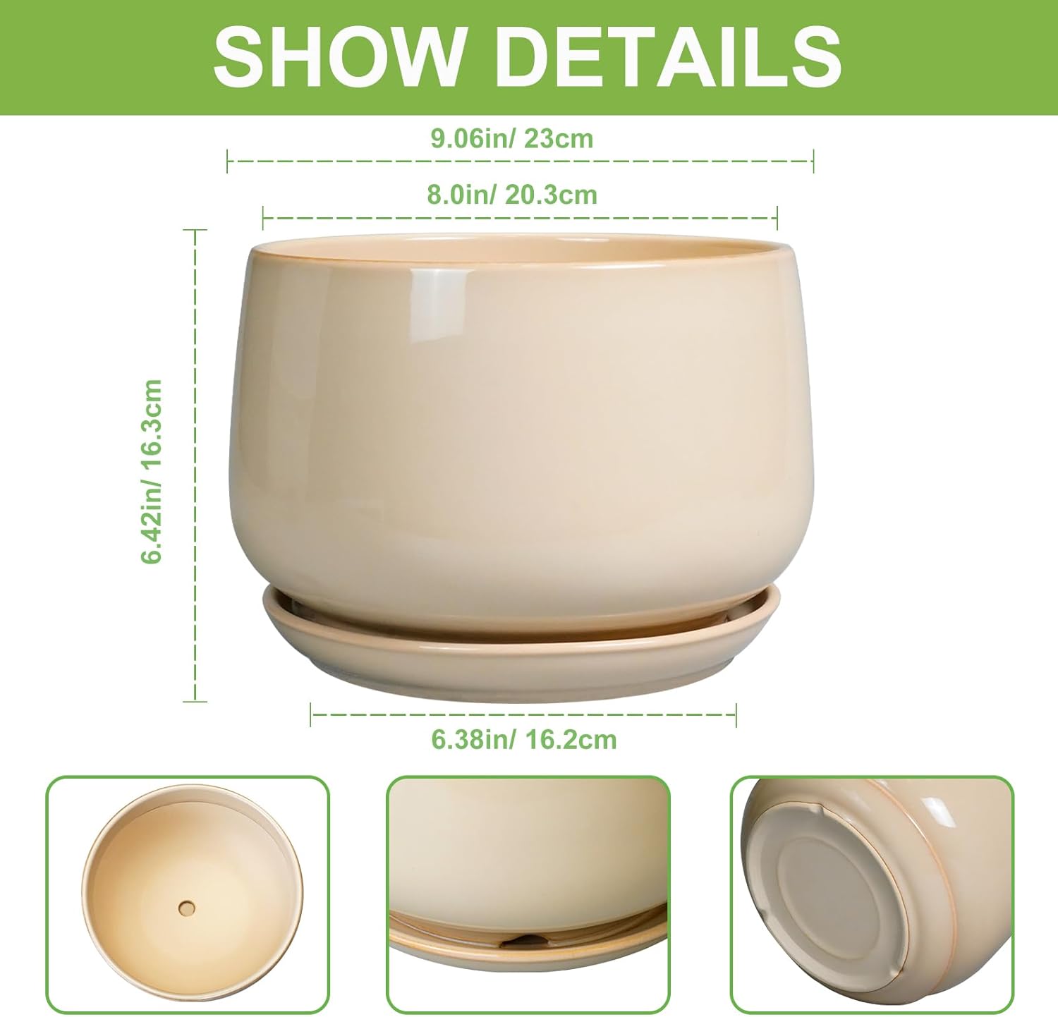 G EPGardening Ceramic Plant Pots - 9 Inch Round Planter, Ceramic Flower Pots with Drainage and Saucer, Modern Indoor Outdoor Planter, Room Decor, Home Gifts, Beige