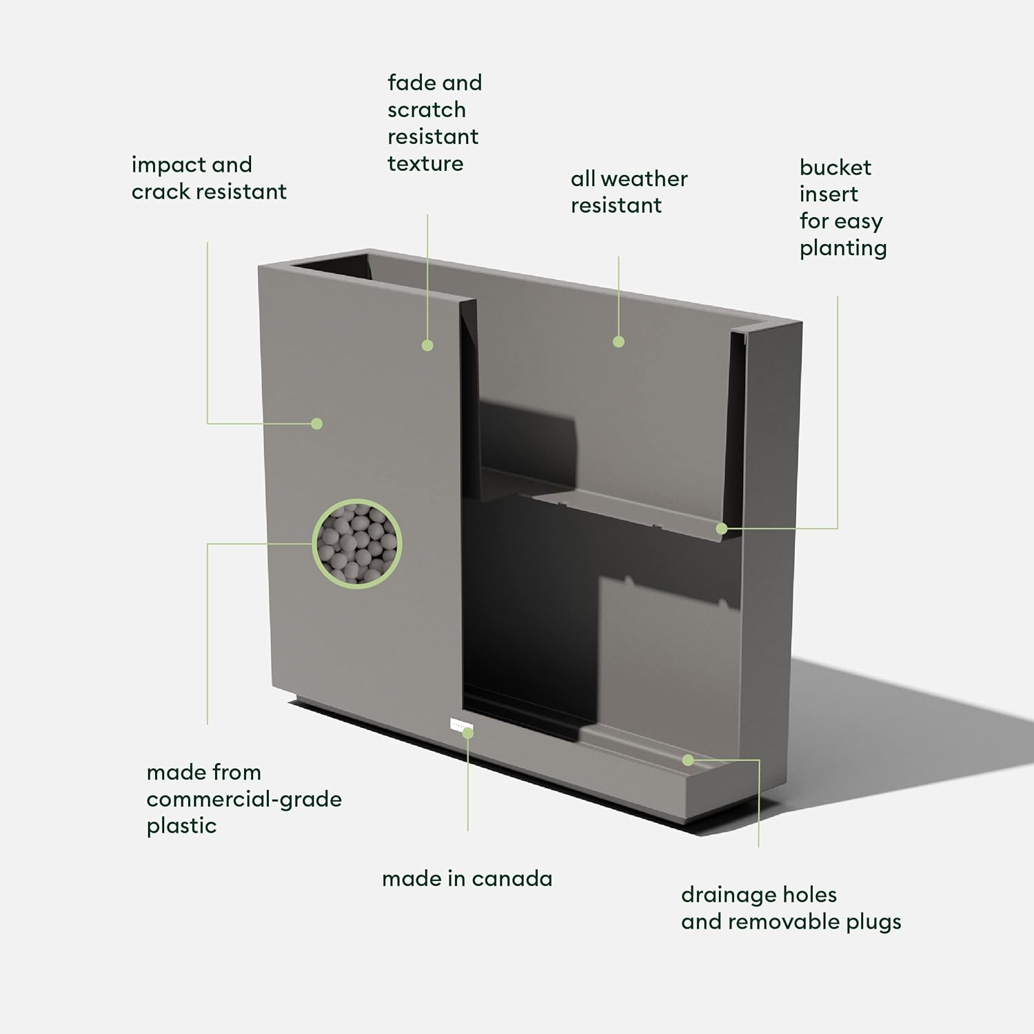 - DIMENSIONS & DETAILS: This double-walled planterโs exterior dimensions measure 30โ in Height, 10โ in Width, 38โ in Length. With the removeable insert bucket installed, the interior dimensions measure 12.85โ in Height, 7โ in Width, 35โ in Length. It comes fully assembled for easy use