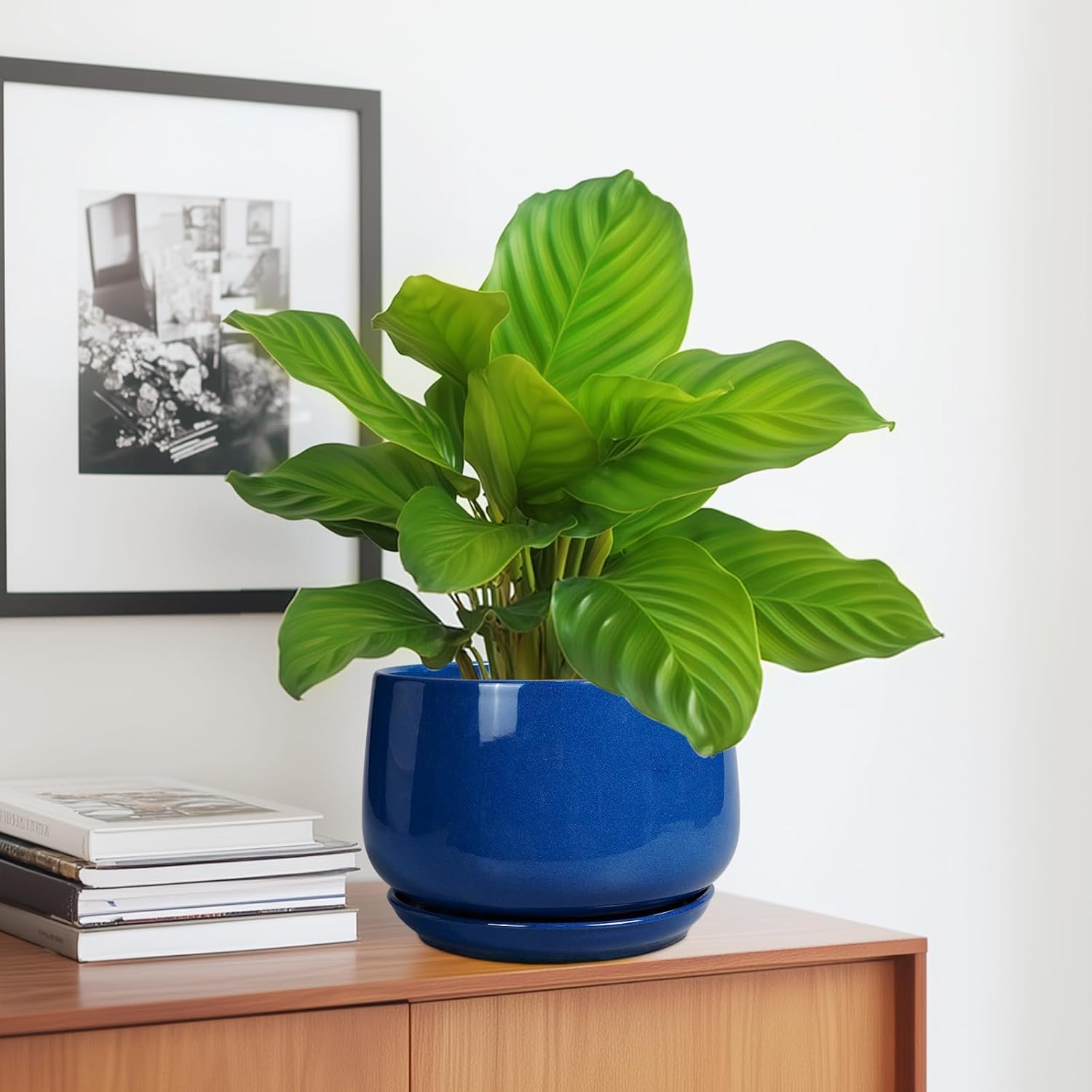 G EPGardening Round Ceramic Plant Pots - 7 Inch Modern Planter with Drainage and Plant Saucer for Indoor Outdoor Flower, Round Office Decor, New Gifts for Home, Blue