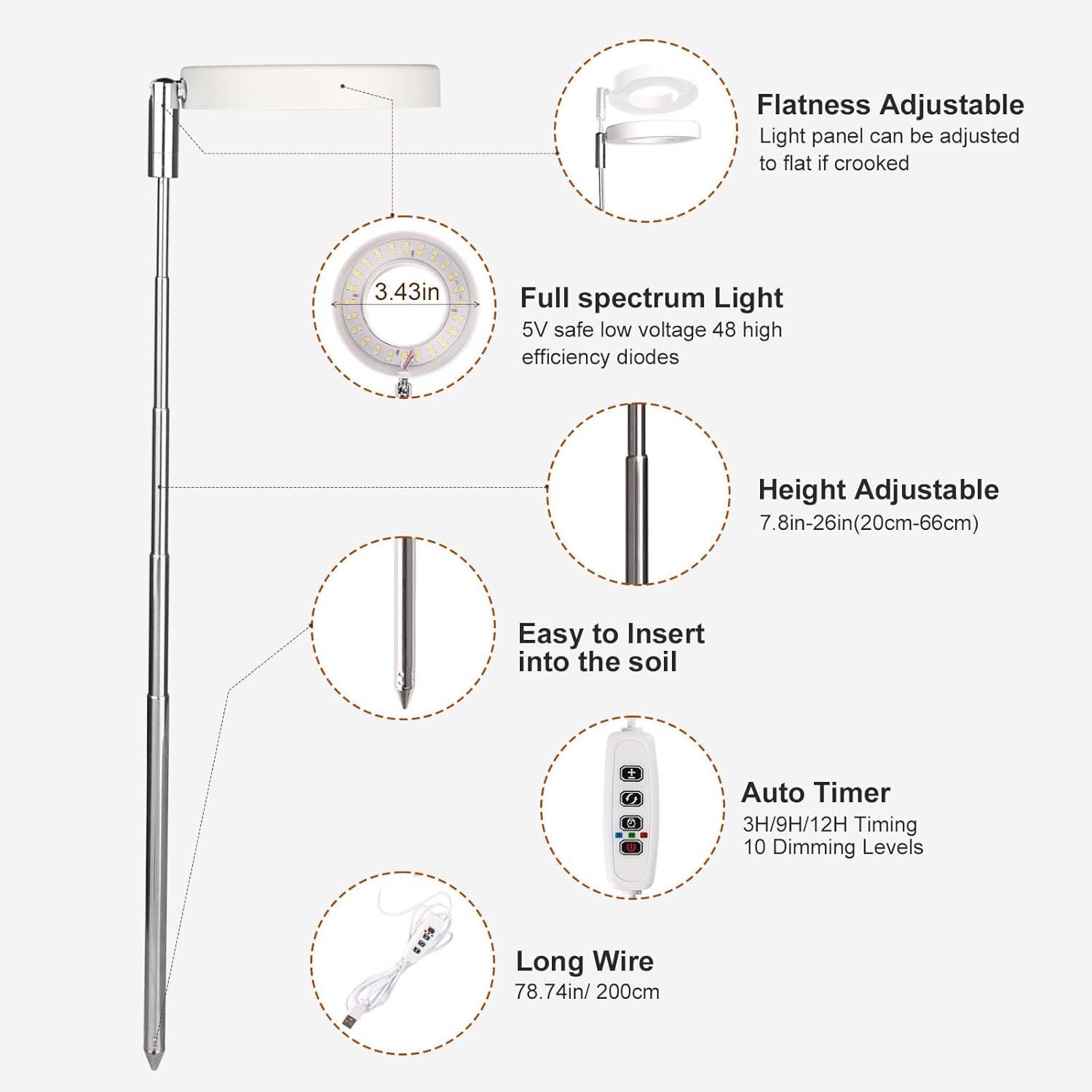 - π Space-Saving Adjustable Height - Telescopic arm (8"-26") fits tabletop planters, shelf gardens, or hanging pots, positioning the grow light at ideal PAR distance for each plant type