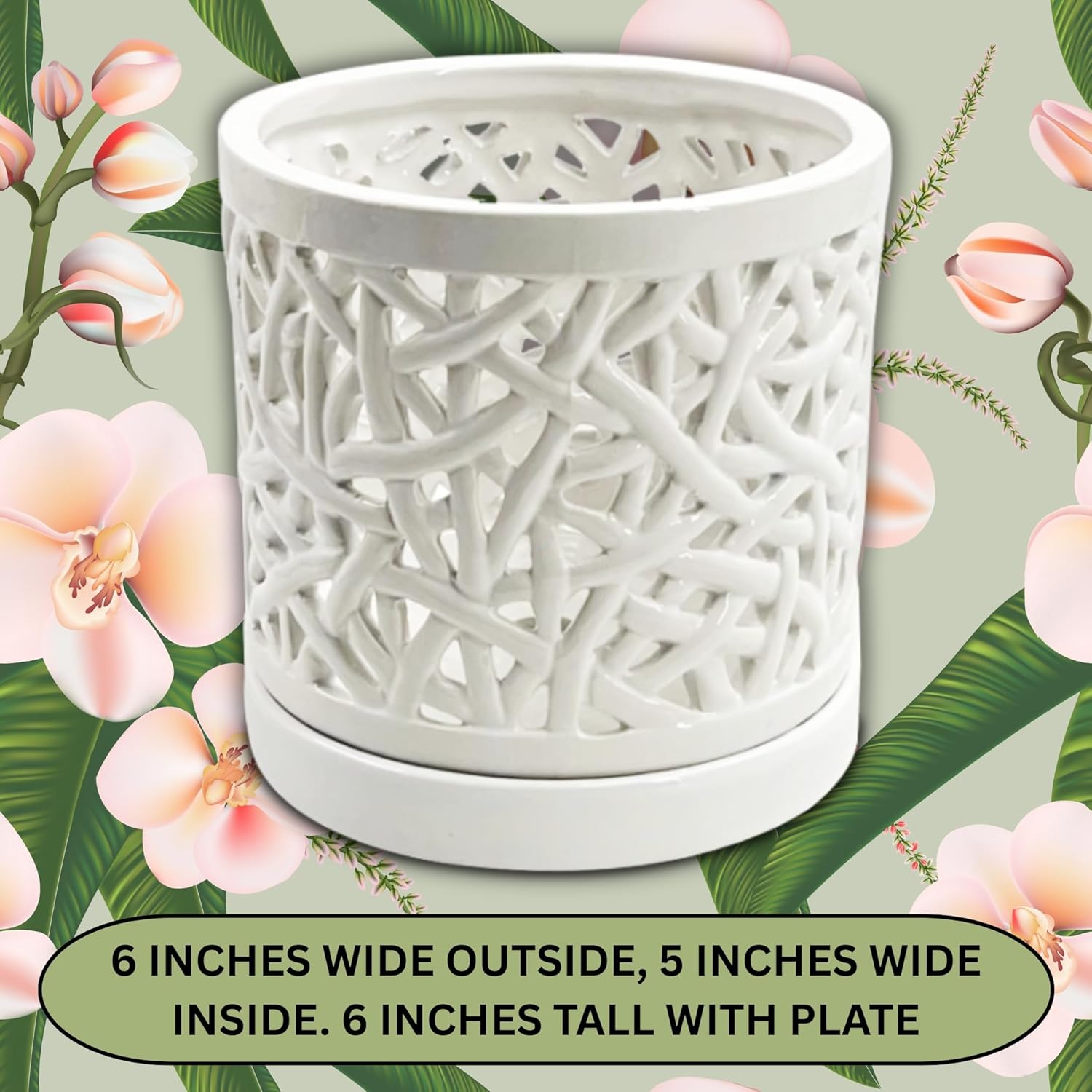 - This elegant large white ceramic orchid pot is 6 inches wide and 6 inches tall with the drainage plate. The inside is just over 5 inches wide. It has holes hand carved in the sides of the pot which help orchid roots to breathe and reduces the risk of root rot