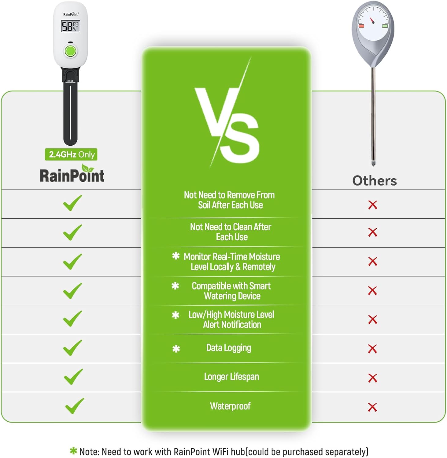 - 【🌿Build Auto-watering System】RAINPOINT provides the Exclusive Solution on Smart Watering. By pairing with the hub, the soil meter can work with other RainPoint smart devices (up to 39 devices) to form an auto-watering system. That will empower you to nurture healthy and thriving plants effortlessly. Ensure your plants thrive with this meter and enjoy healthy, flourishing greenery all year round.