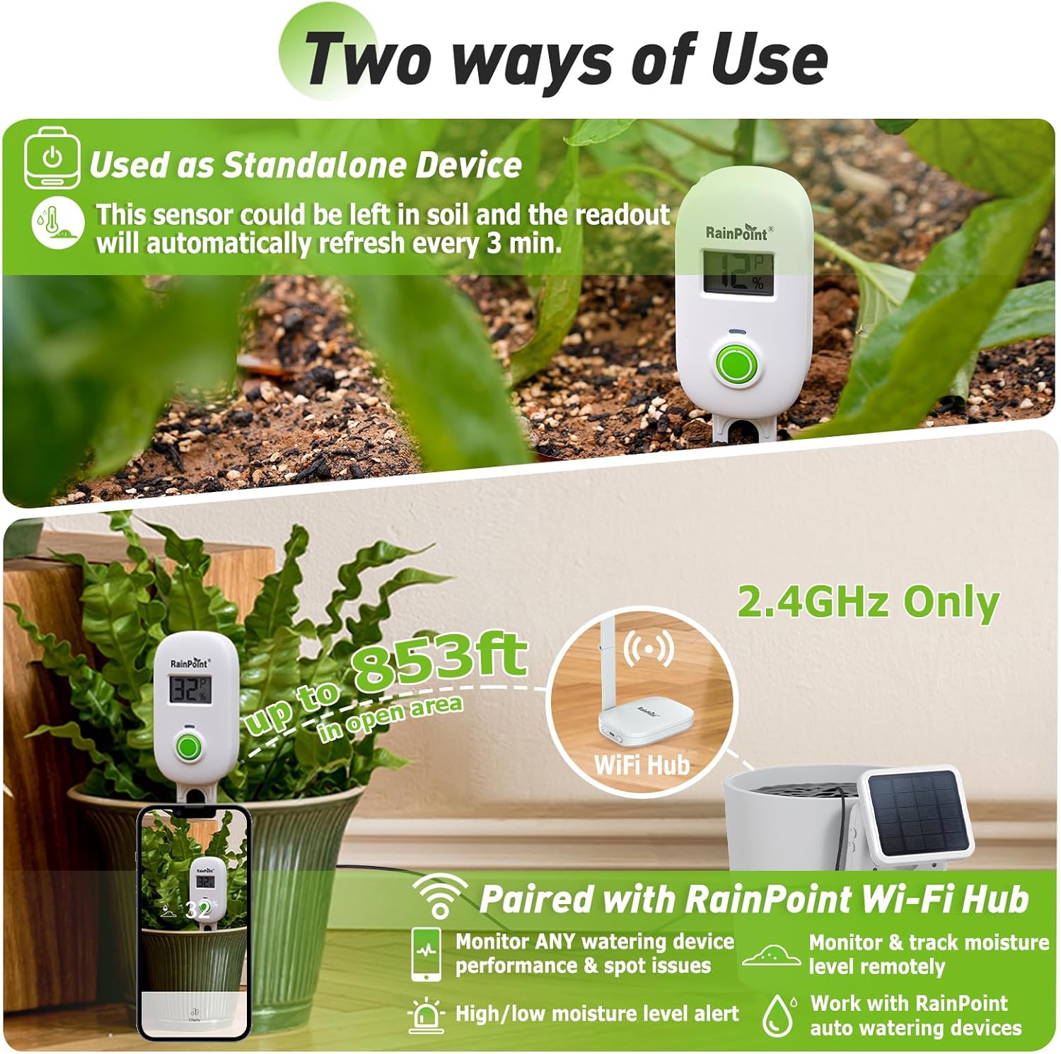 - 【2️⃣Two Ways Of Use】 When used alone, the large display give you an at-a-glance snapshot of current conditions. Or you could pair it with our Wi-Fi hub (2.4 GHz only, models: HWG023/HWG023WBRF/HWG040) to remote monitor, choose soil type and enjoy many other smart features via RainPoint Home App(tablet & mobile phone).