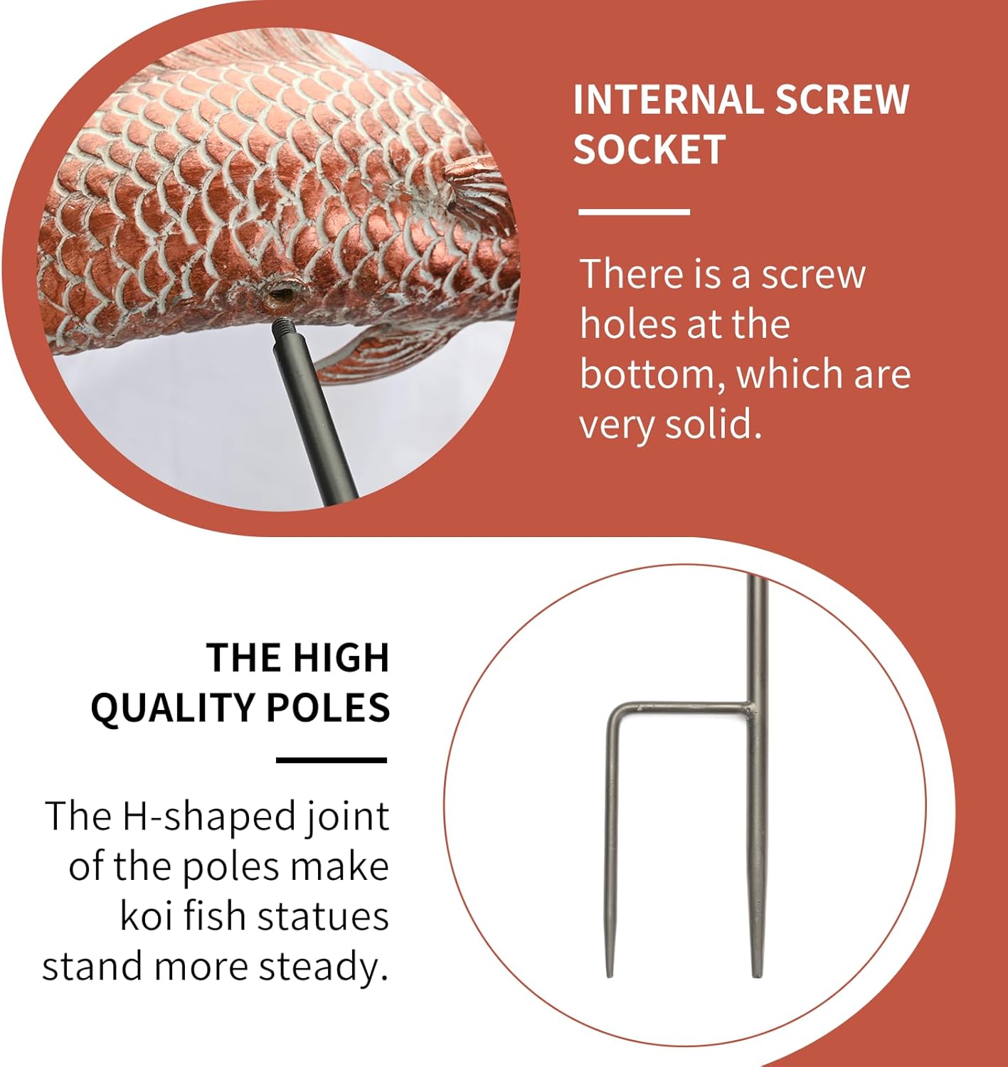 - Our koi fish garden decor Sculptures are carefully handcrafted by skilled artisans. The fish scales are made into strips and then stacked to create a 3D effect, making the statue look more prominent. The statue is hollow, so it is lightweight and easy to display.