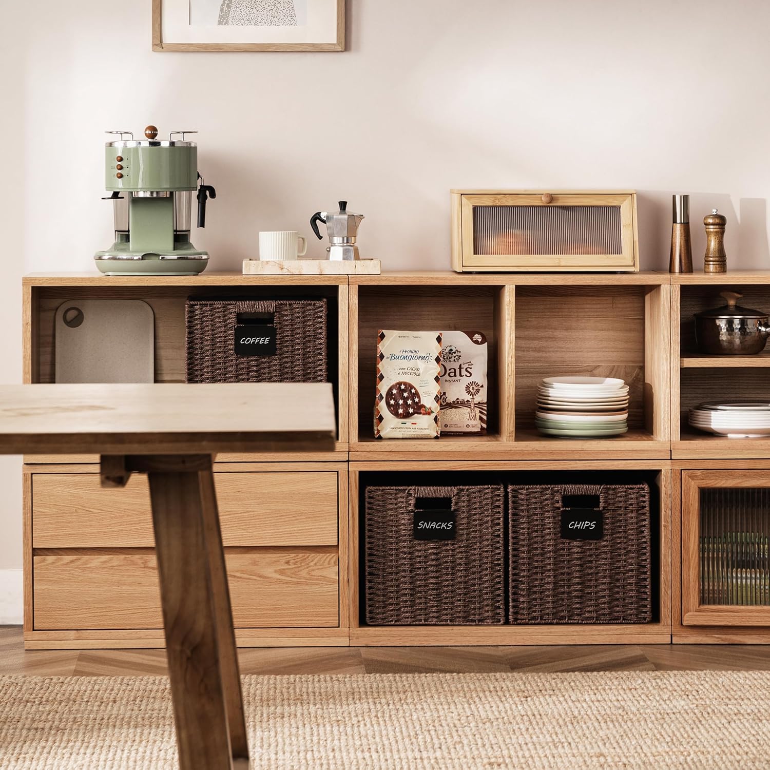 UBBCARE 4 Pack Wicker Basket, 10.5×10.5 Storage Cubes with Label, Foldable Cube Storage Bin with Handle, Square Storage Basket for Shelves, Woven Paper Rope Basket for Organizing, Brown