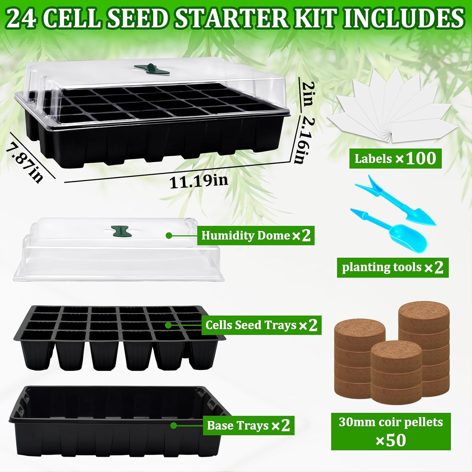 - Package Includes: You will get 2 × transparent lid, 2 × bowhnot hunmidity valve, 2 × seed tray, 2 × base tray, 100 × labels, 50×coco pellets, 2 × plant tools for sowing, this seedling starter tray has everything you need for planting. (24 cells per tray, 2 sets total 48 cells)