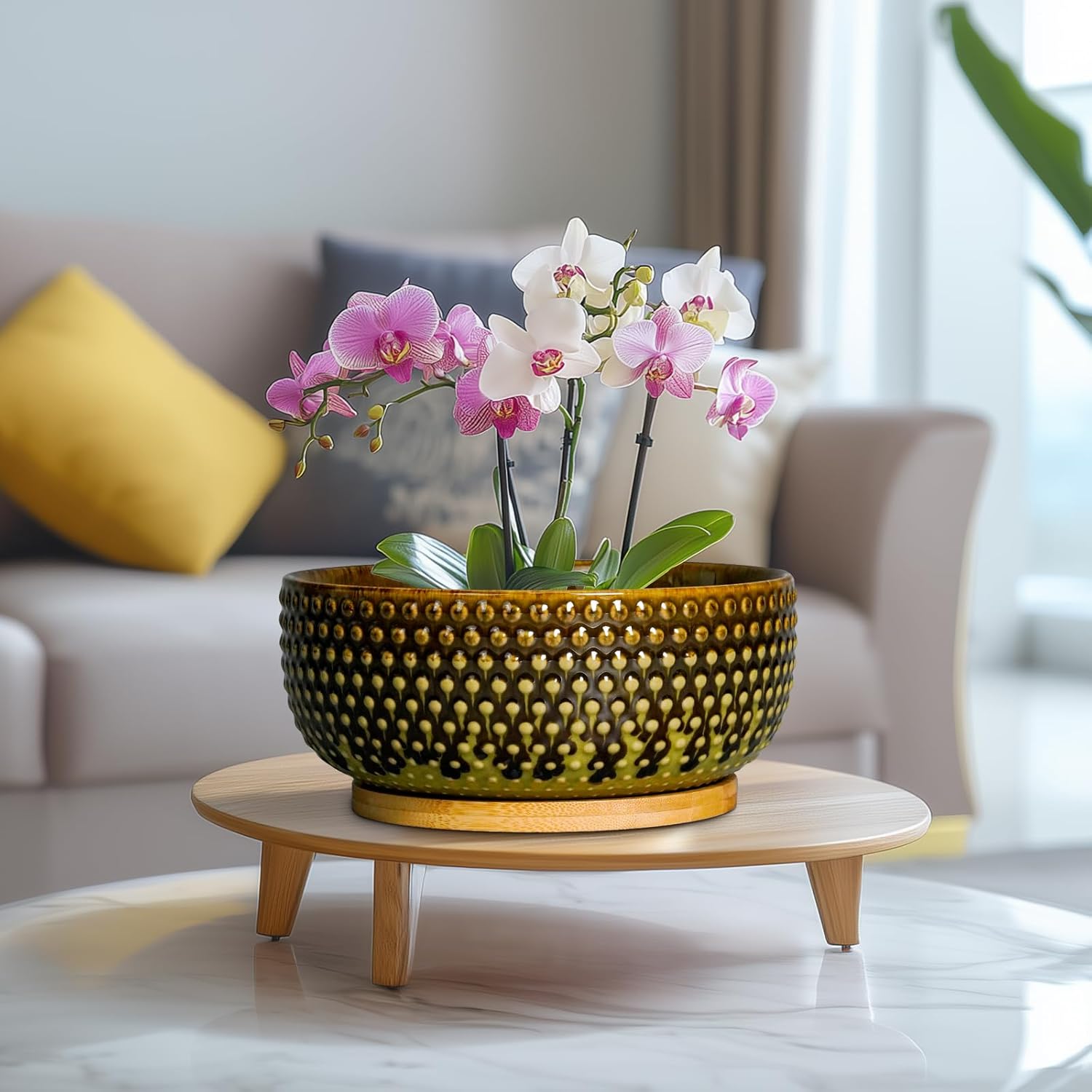Bonsai Pots 8 Inch - Ceramic Planter for Indoor Plants, Succulent Pots with Drainage Hole and Plant Tray, Modern Round Decorative Flower Planters, Home Decor, Brown & Green