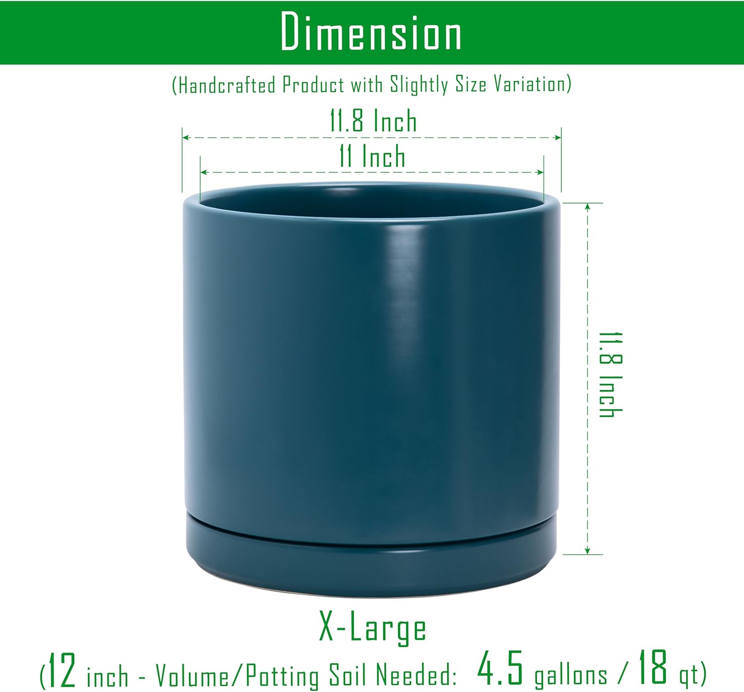 - X-Large 12 Inch Planter Pot: 11.8" Diameter x 11.8" H, teal color. Potting Soil Needed: 4.5 gallons / 17 qt.