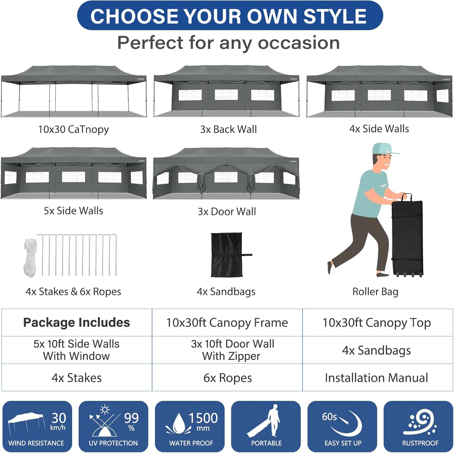 COBIZI 10x30 Pop up Canopy Tent Heavy Duty with 8 Sidewalls, Easy Set-up Commercial Outdoor Party Tent, 100% Waterproof Wedding Gazebo, 3 Height Adjustable with Wheeled Bag,Grey
