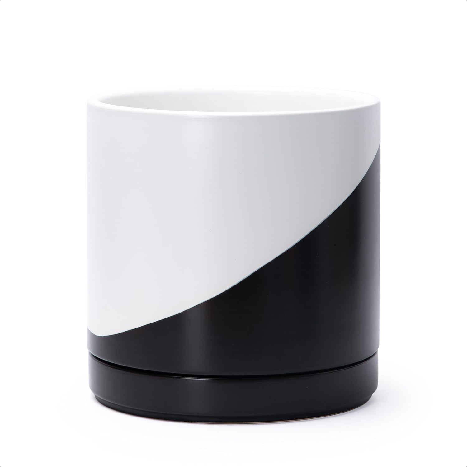 D'vine Dev 8.2 Inch Ceramic Planter Pot with Drainage Hole and Saucer, Indoor Cylinder Round Planter Pot, Oblique Monochrome Black and White, 94-O-D-K