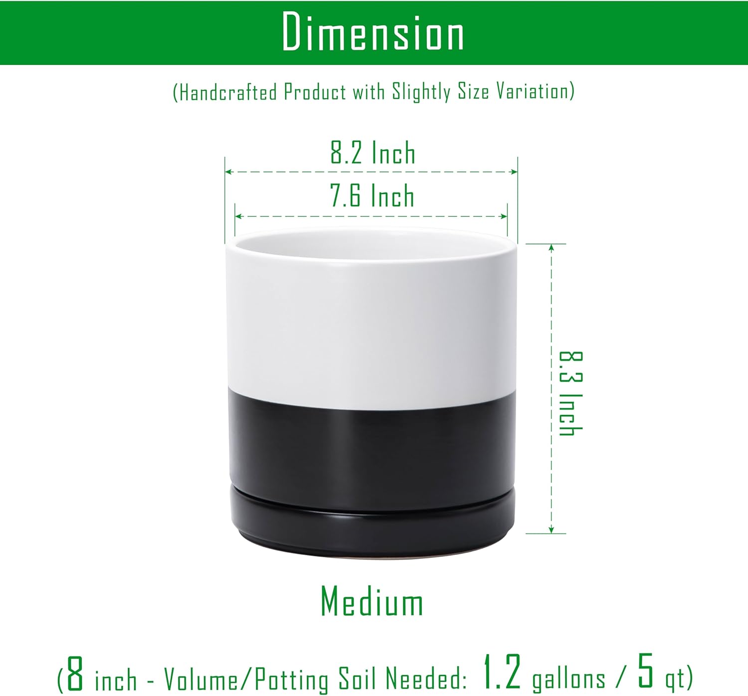• Multiple Size Options: Available in six sizes (3.5" to 11.8") to fit plants of all types, from small succulents to larger houseplants. Medium 8 Inch Planter Pot: 8.2" Diameter x 8.3" H, Potting Soil Needed: 1.2 gallons / 5 qt.