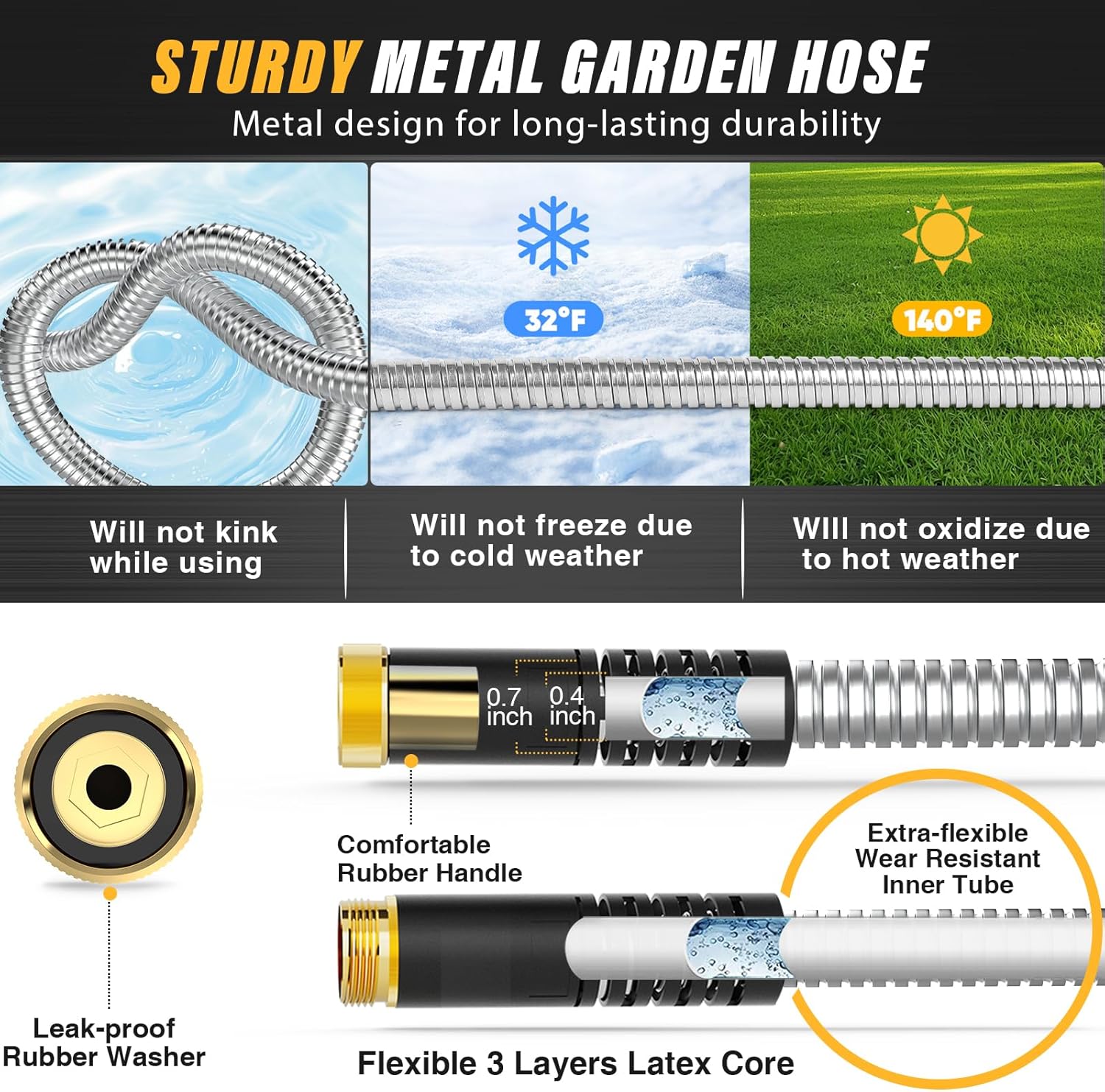 - 【Flexible and Kink Free, Easy Lefree】- Metal garden hose features a spiral interlink design, metal hose cover is tightly connected so that no matter how much the hose is pulled,the inner tube stays in place, it effectively prevents kinks and allows for easy coiling and maneuvering. Flexible water hose is easier to handle and lighter in weight compared to traditional hoses.