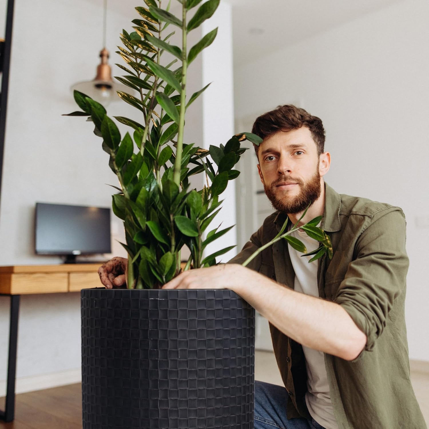 D'vine Dev 14 Inch Modern Geometric Tile Patterned Sleek Planter Pot with Stand, Indoor Outdoor Decorative Plant Holder, Distressed Black, 88-Z-D-5