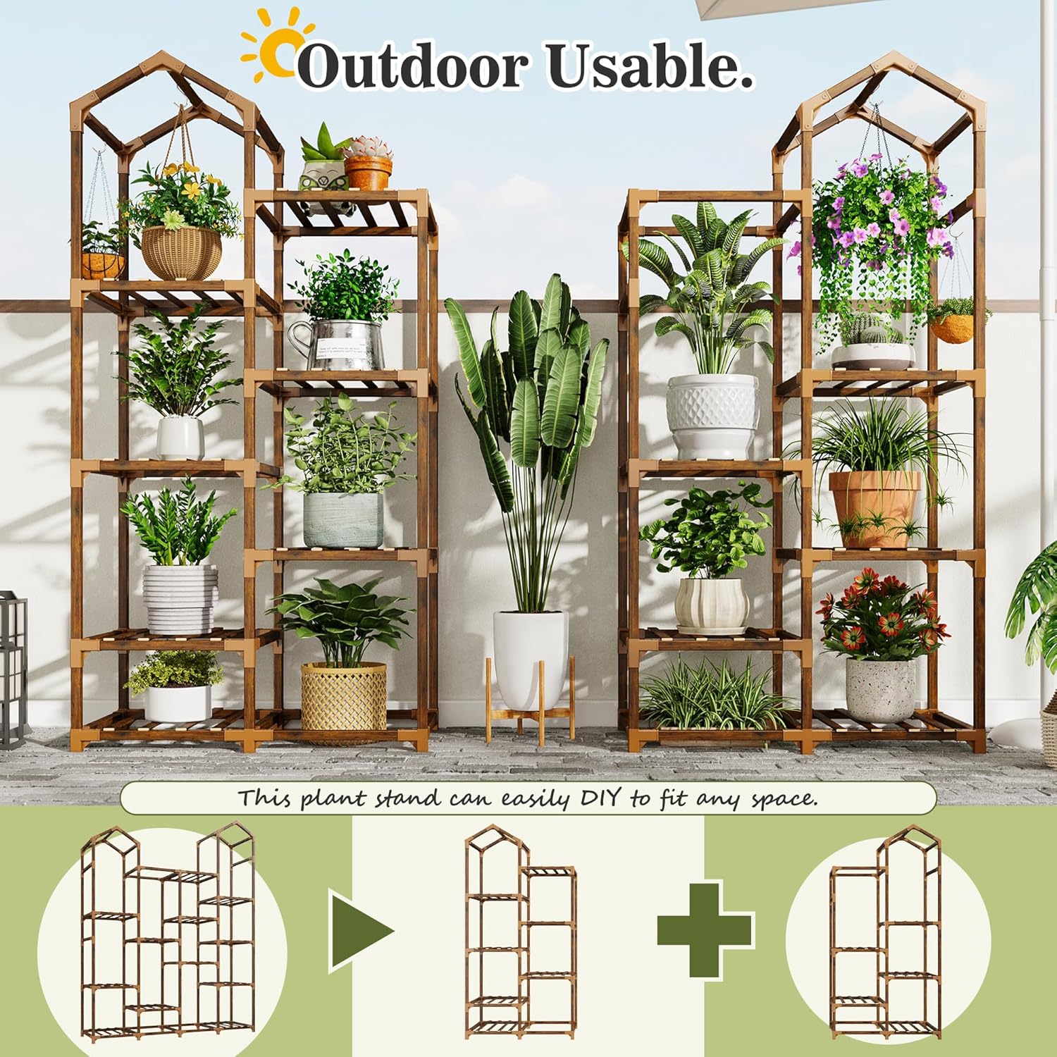 - 【Durable Carbonized Natural Wood and DIY Plant Shelves】The plant racks are made of premium wood and carbonized at high temperature, no fade, shrink, warp. This process not only extends its lifespan but also ensures it remains a healthy choice, eliminating the need for extra paint or varnish, that enhances waterproof performance and extend service life for both indoor and outdoor use. You can customize the configuration, DIY to suit your preferences! Easily switch up the overall shape of the plant stand by simply changing the connections around. You can also split or connect multiple kits together to make displays that fit your space and create your indoor garden