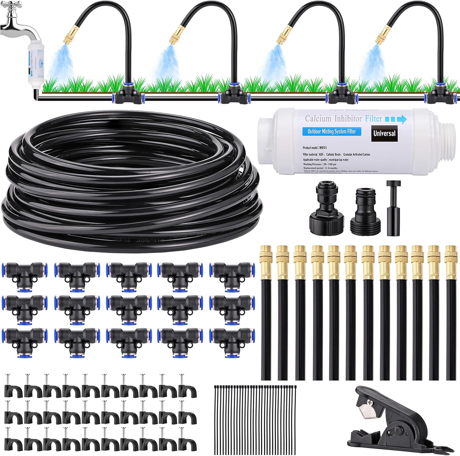 - 【Package】: Mornajina drip irrigation system kit comes with 9 kinds of accessories, including ① 1 x Calcium Inhibitor Filter; ② 1 x 66FT 5/16 inch Irrigation Tubing Hose, 6mm/0.24inch ID & 8mm/0.31inch OD; ③ 20 x 8.3 inch 360-degree Bendable Support Rod with Brass Mist Nozzle; ④ 20 x Misting Nozzles Tees; ⑤ 1 x 3/4 inch (25mm) Faucet Adapter (One side connected to 3/4 inch (25mm) Standard water tap, and the other side connected to 8mm tubing pipe); ⑥ 40 x Cable Ties; ⑦ 40 x Saddle Clamps; ⑧1 x End Plug; ⑨ 1 x Pipe Cutter. They are perfect for a comprehensive irrigation system.