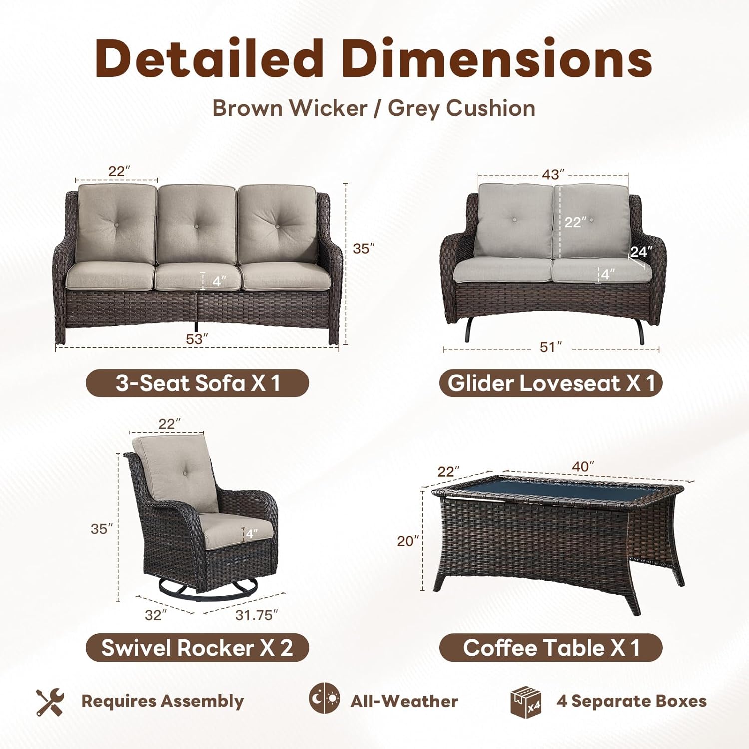 - 5-Piece Outdoor Patio Furniture Set β This patio furniture set includes a loveseat glider, two swivel rocker chairs, a sofa, and a multifunctional coffee table with storage for the Belord ottoman. Perfect for patios, porches, and backyards, it combines relaxation and style for any outdoor setting.