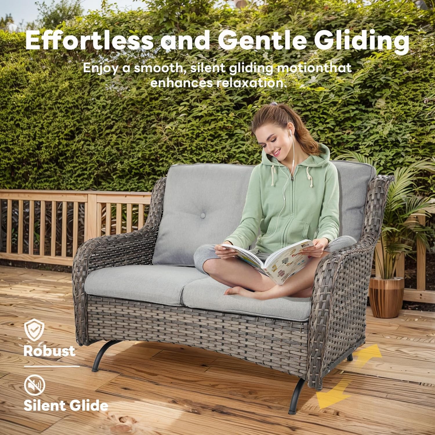 - Comfortable Swivel Rocker Chairs & Loveseat Glider: Enjoy the smooth glider and 360Β° swivel features of the two rocker chairs, perfect for relaxing and unwinding. The loveseat offers a gentle gliding motion, ensuring a cozy outdoor experience for two. It is ergonomically designed with wide armrests and thick 4-inch cushions for maximum comfort.