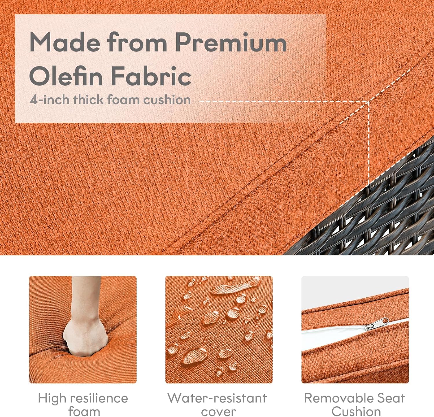 - 4.Comfortable And Easy To Clean: Both chairs in this outdoor patio set are equipped with 4-inch thick foam seat cushion and 8-inch thick cotton back cushion, which is ergonomic and improves the overall comfort of the wicker chair. The patio chair cushion covers are made of outdoor specialty olefin fabric that is water resistant, and each cushion is equipped with zippers that are removable and easy to clean.