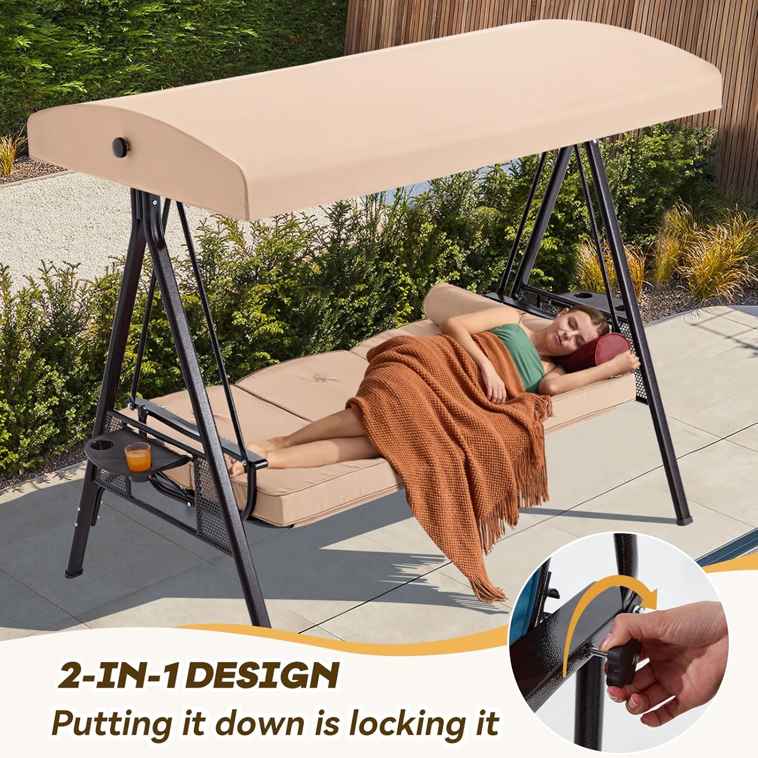 - ă3 in 1 Bed with 3 Seatsă: This porch swing chair can be converted into a porch swing bed. Patio swing with stand 3 in 1 design provides the bigger place for resting, napping, or basking in the sun. Once the backrest of yard swing is lowered, it securely locks in place, ensuring outdoor porch swing stability without unnecessary swaying.