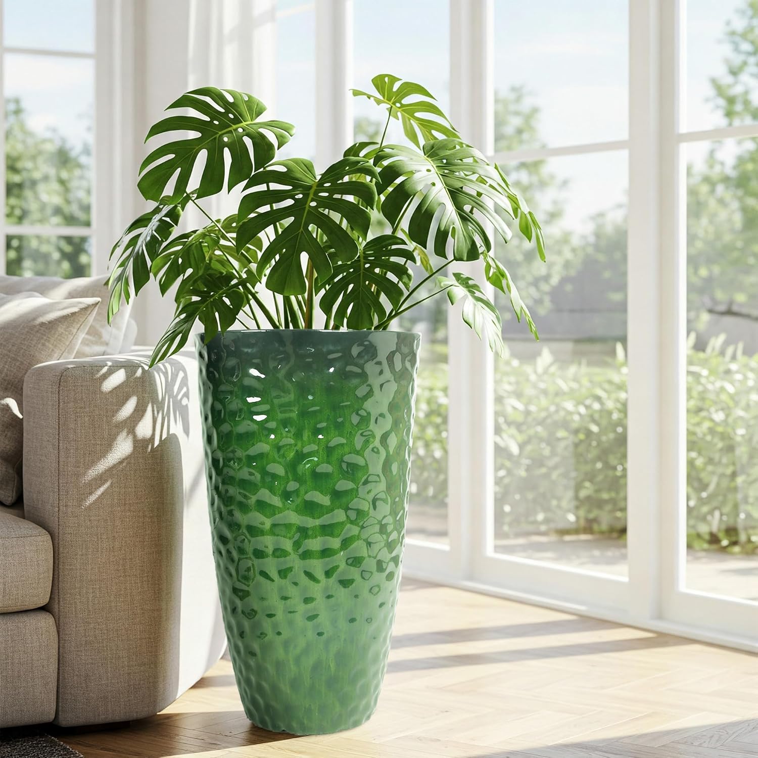 Worth Garden 14" Dia x 24" H Large Plastic Planters with Drainage Hole, Set of 2 Hammered Texture Green Glossy Smooth Finish, Tall Round Decorative Flower Plant Pot for Indoor Outdoor, Front Porch