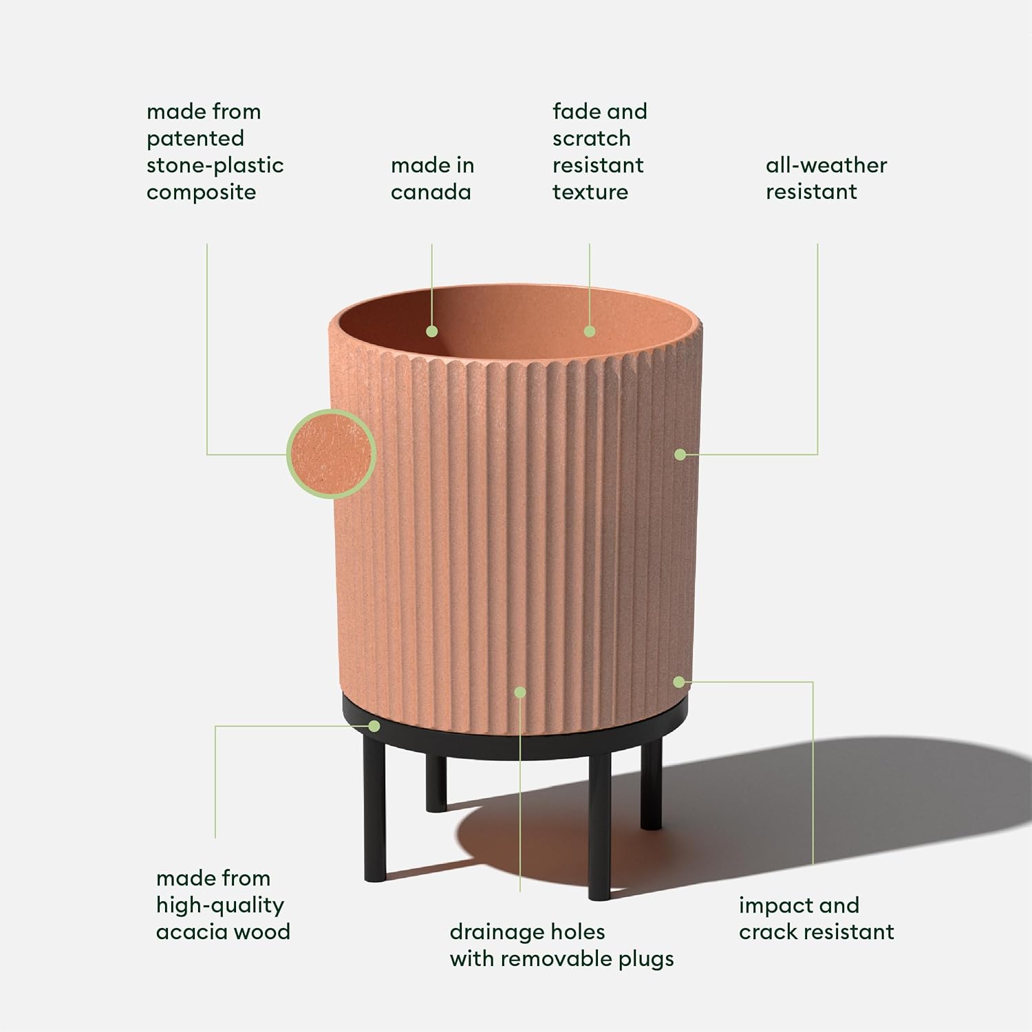 - Material : Plastic-stone composite planter & Acaia wood stand