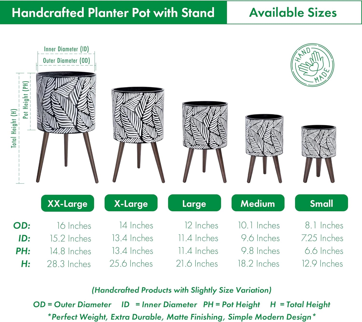 - XX-Large Pot with Stand Set: planter size: 16 inch; pot inner diameter 15.2 inch; pot with stand total height: 28.3 inch.