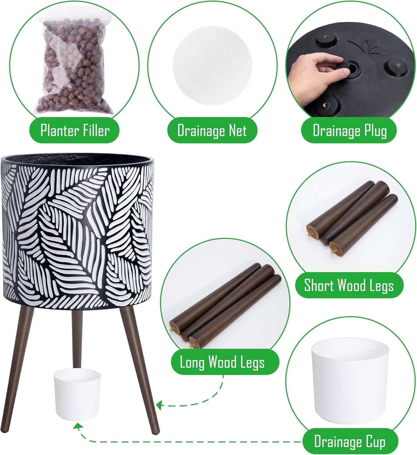 - Whatβs included: planter pot with drainage hole, drainage plug, set of 2 stand (3 long wooden legs & 3 short wooden legs).