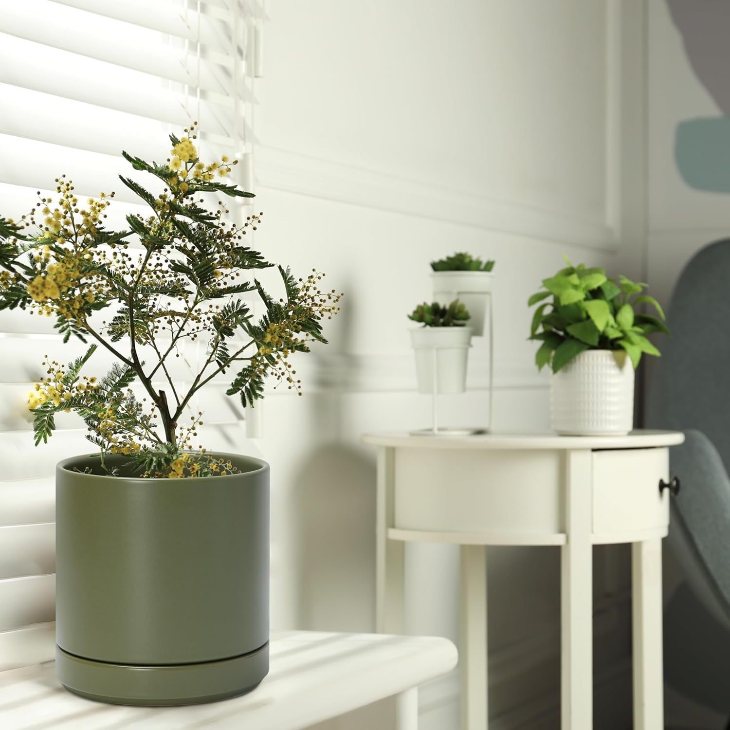 D'vine Dev 6 Inch Ceramic Planter Pot with Drainage Hole and Saucer, Indoor Cylinder Round Planter Pot, Olive, 94-O-C-J