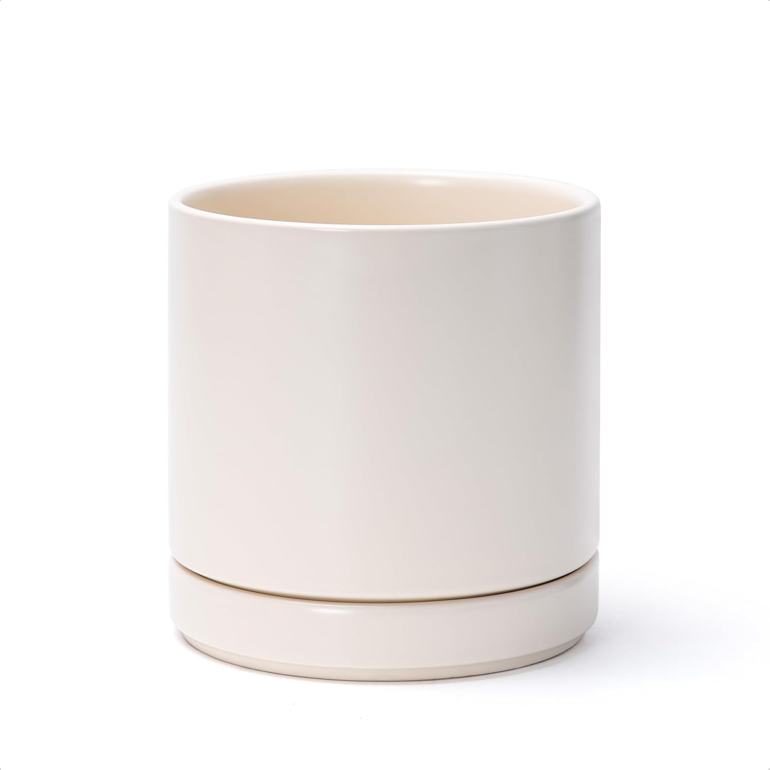 D'vine Dev 6 Inch Ceramic Planter Pot with Drainage Hole and Saucer, Indoor Cylinder Round Planter Pot, Oatmeal, 94-O-C-8
