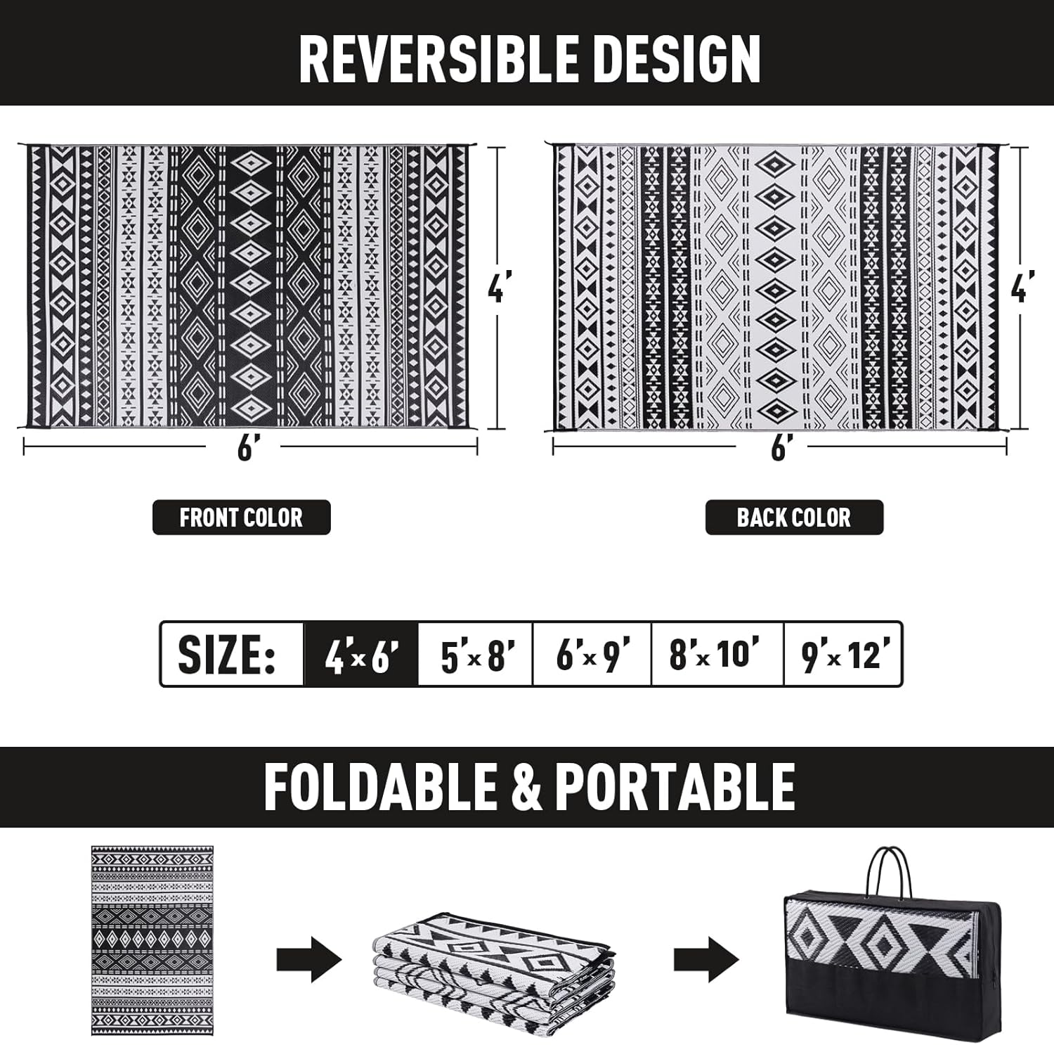 WILDROOTS 4x6 Feet Black and White Plastic Outdoor Rug, Stain Resistant Waterproof Reversible Outdoor Patio Rug, Fade Resistant Camping Rug
