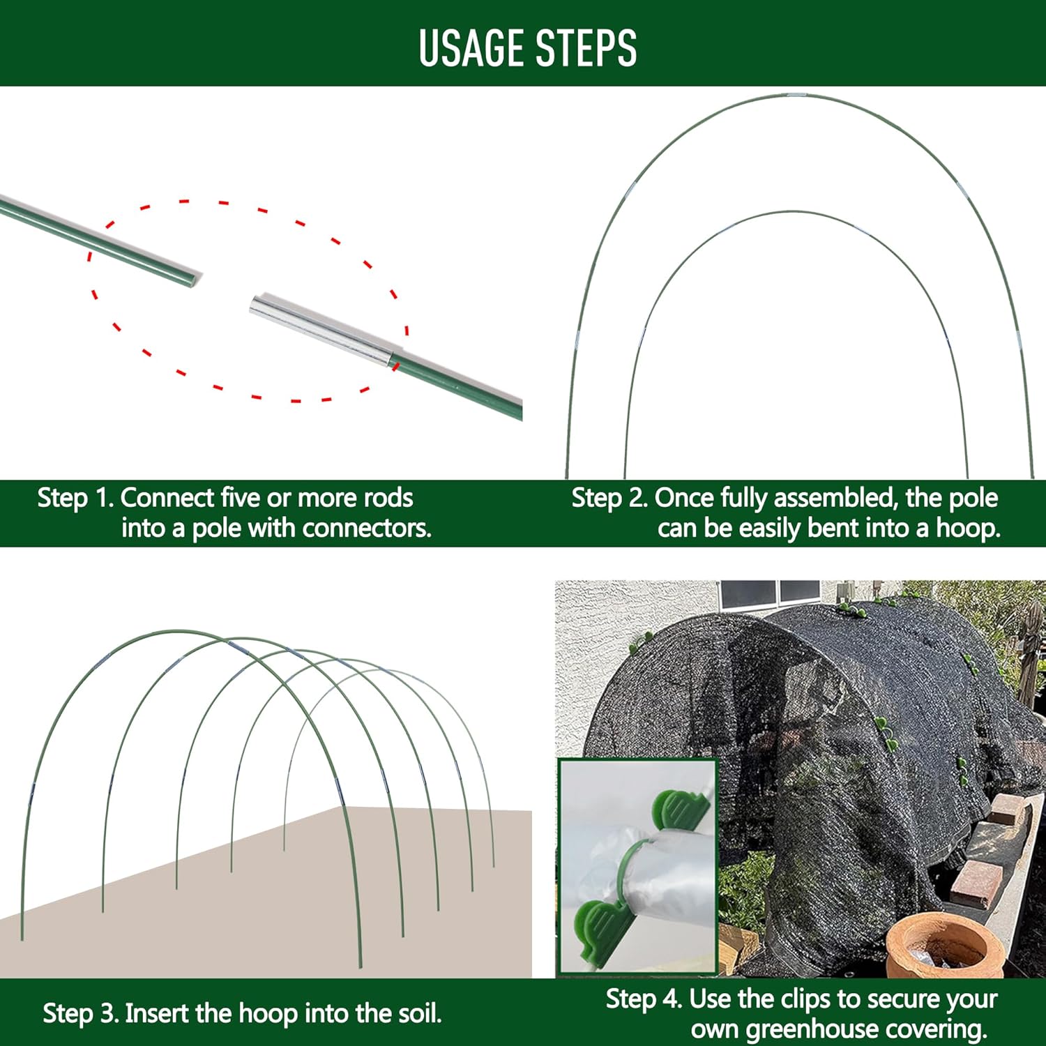 - 【JUST BEND IT】Use the connectors to join the required number of rods. As you bend the hoops, they connect securely. Insert them into the soil, and you'll find these hoops can be reused season after season.